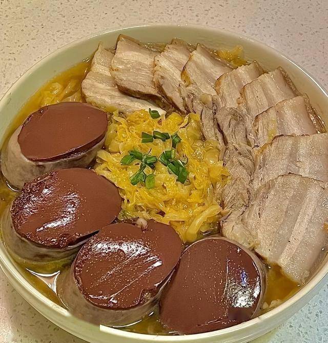 这是一道极具地方特色且风味独特的传统菜肴,将东北饮食文化的精髓浓缩其中。它巧妙地将东北三种标志性食材——酸菜、白肉(五花肉)、血肠——完美组合。