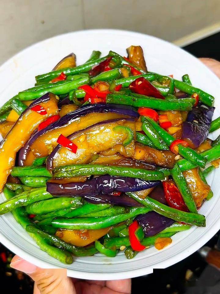 这道菜的准备工作包括切好茄子和四季豆,准备好干辣椒、青红椒和蒜。首先,将茄子和四季豆分别炸至虎皮状,然后与蒜末、干辣椒一起翻炒,最后加入调味料和青红椒条,简单快速,味道却十分出色。