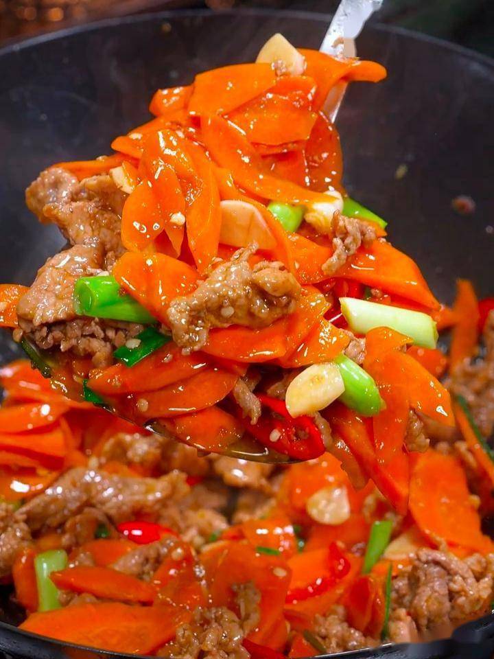 选用牛肉和胡萝卜为主料,辅以小米辣和大蒜叶。牛肉切片腌制后炒至变色,再与胡萝卜片一同翻炒,最后加入调味料和大蒜叶,色彩鲜艳,口感丰富。