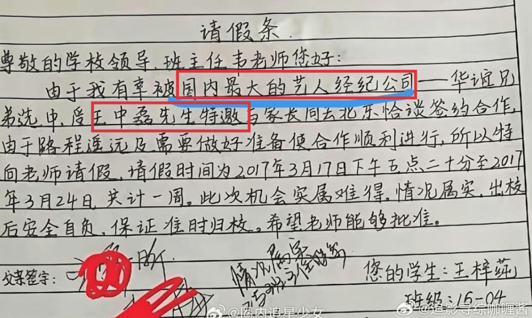 网传高中时期的请假条,洋洋洒洒的「被国内最大的娱乐公司选中」「受王中磊先生特邀去签约」👇