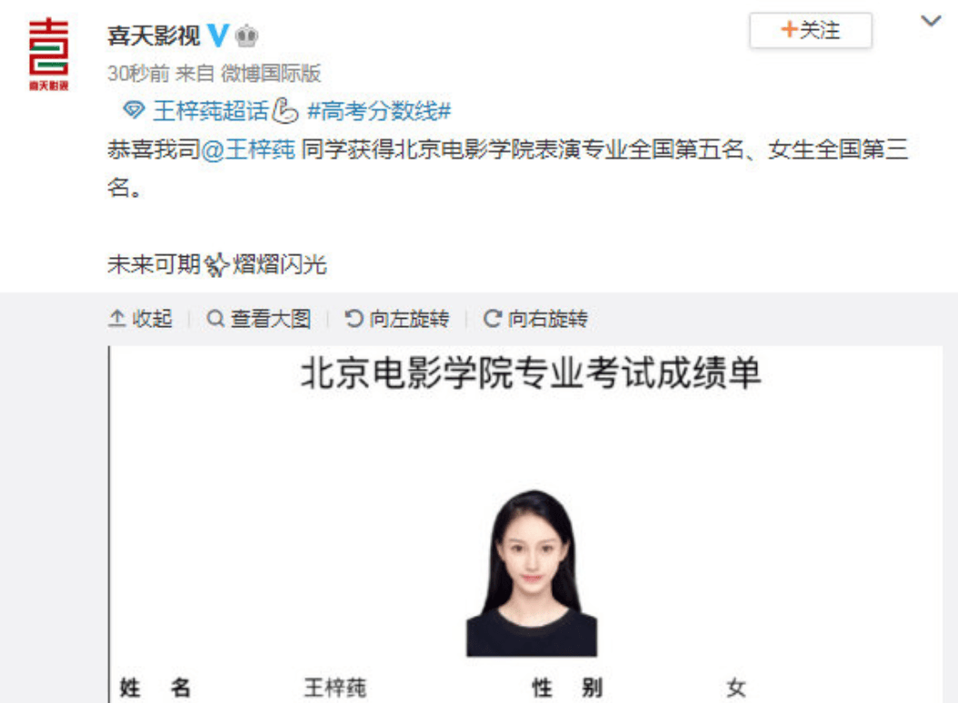 而是根据时间线来看,大概是高考之前就签了,高考成绩出来喜天还发了大字报👇
