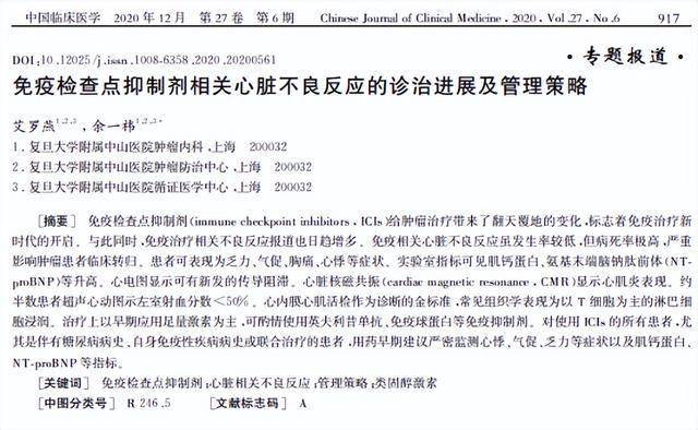 艾罗燕.免疫检查点抑制剂相关心脏不良反应的诊治进展及管理策略, 中国临床医学, 2020-12-24