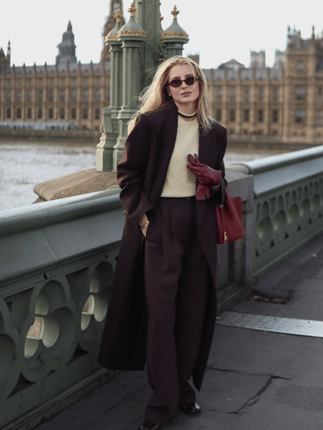 同色系毛呢半裙:深棕或驼色裙装延续高级感,搭配长靴保暖显高。