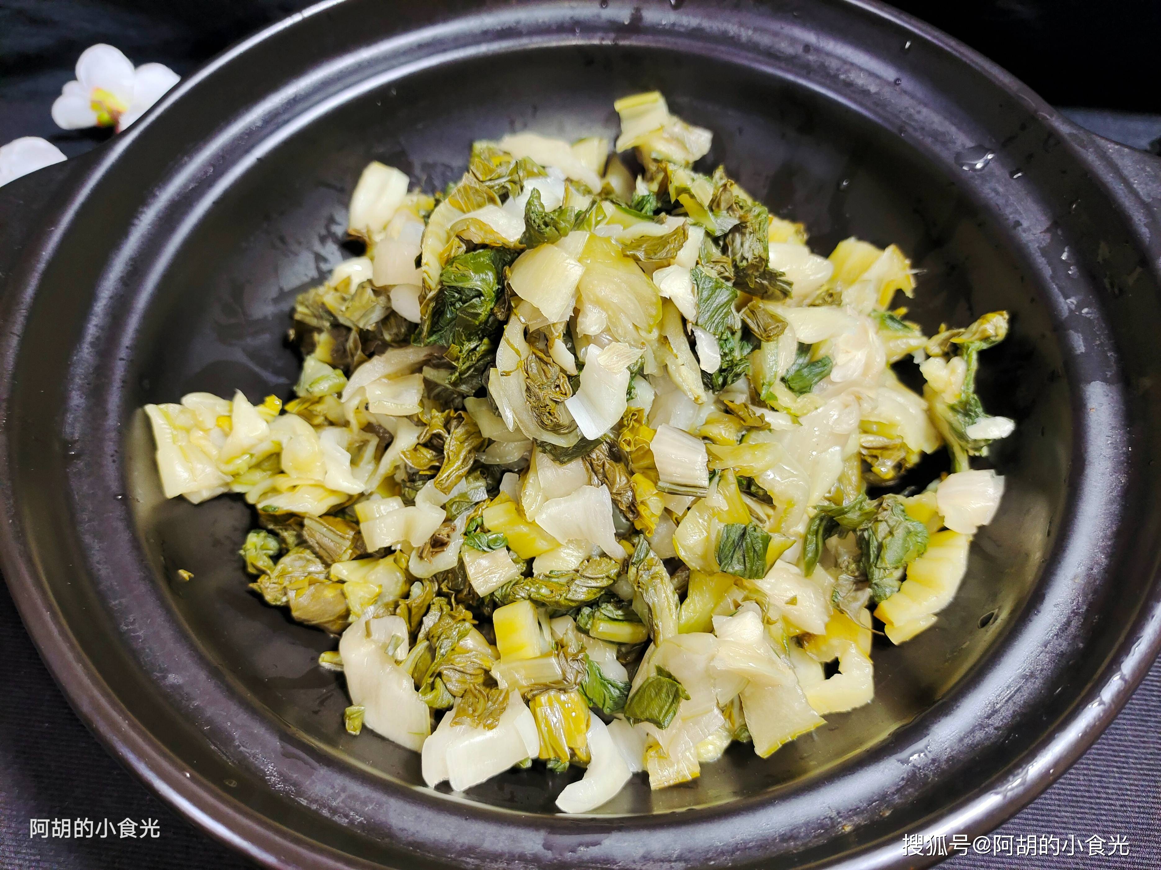 “今天用的酸菜就是本地的土酸菜(无盐的),超市中袋装的咸酸菜感觉做不出那种口味。这种土酸菜的腌制方法也很简单,就和东北酸菜的方法基本一致,只不过一个用的是大白菜,一个用的是大青菜。我们就挑选两三棵这样的土酸菜用清水冲洗干净,而后将其切碎后再抓起挤干水分待用。”