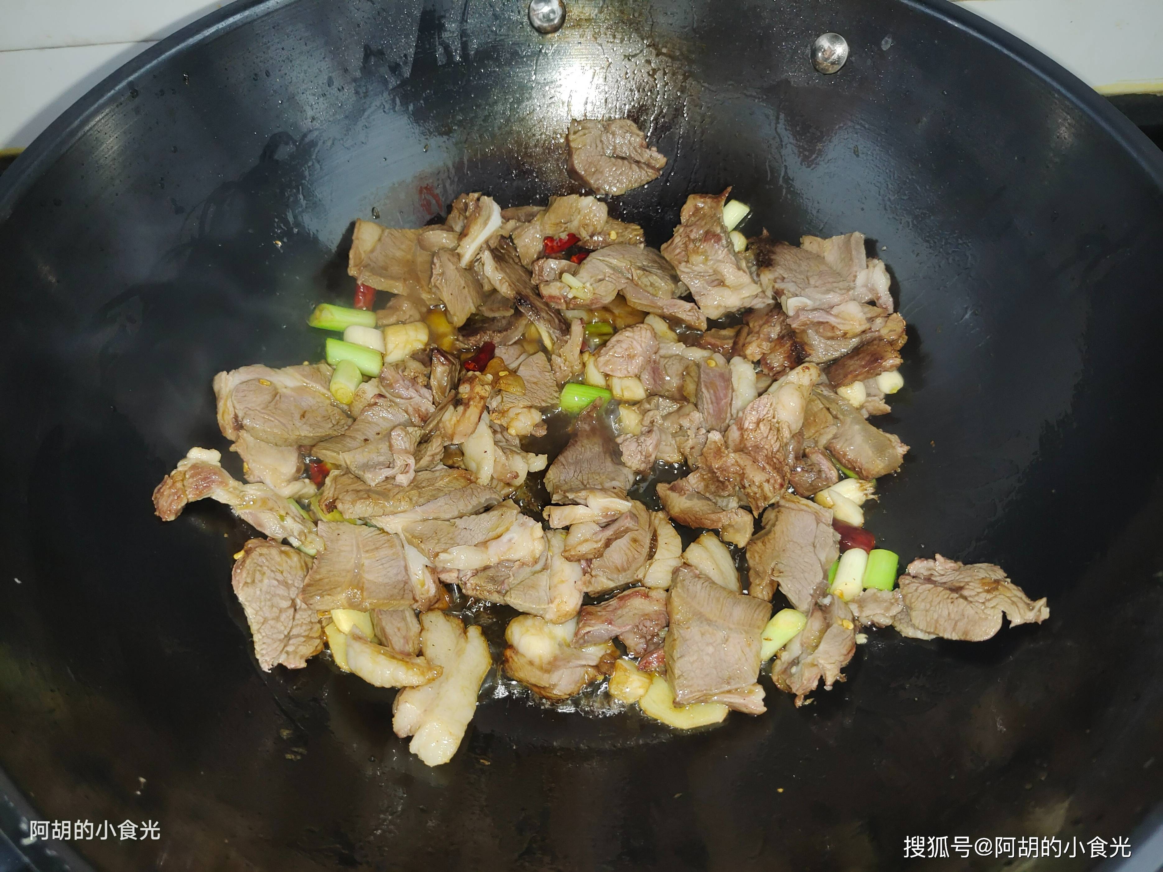 “食材都很简单,备好后就可以开火烹饪了。先小火把锅烘干,淋入一些菜籽油烧热,此时直接把羊肉片倒入油锅中炒一炒,把葱姜蒜和干辣椒也一块丢入锅中,淋入一些生抽炒出香味。”