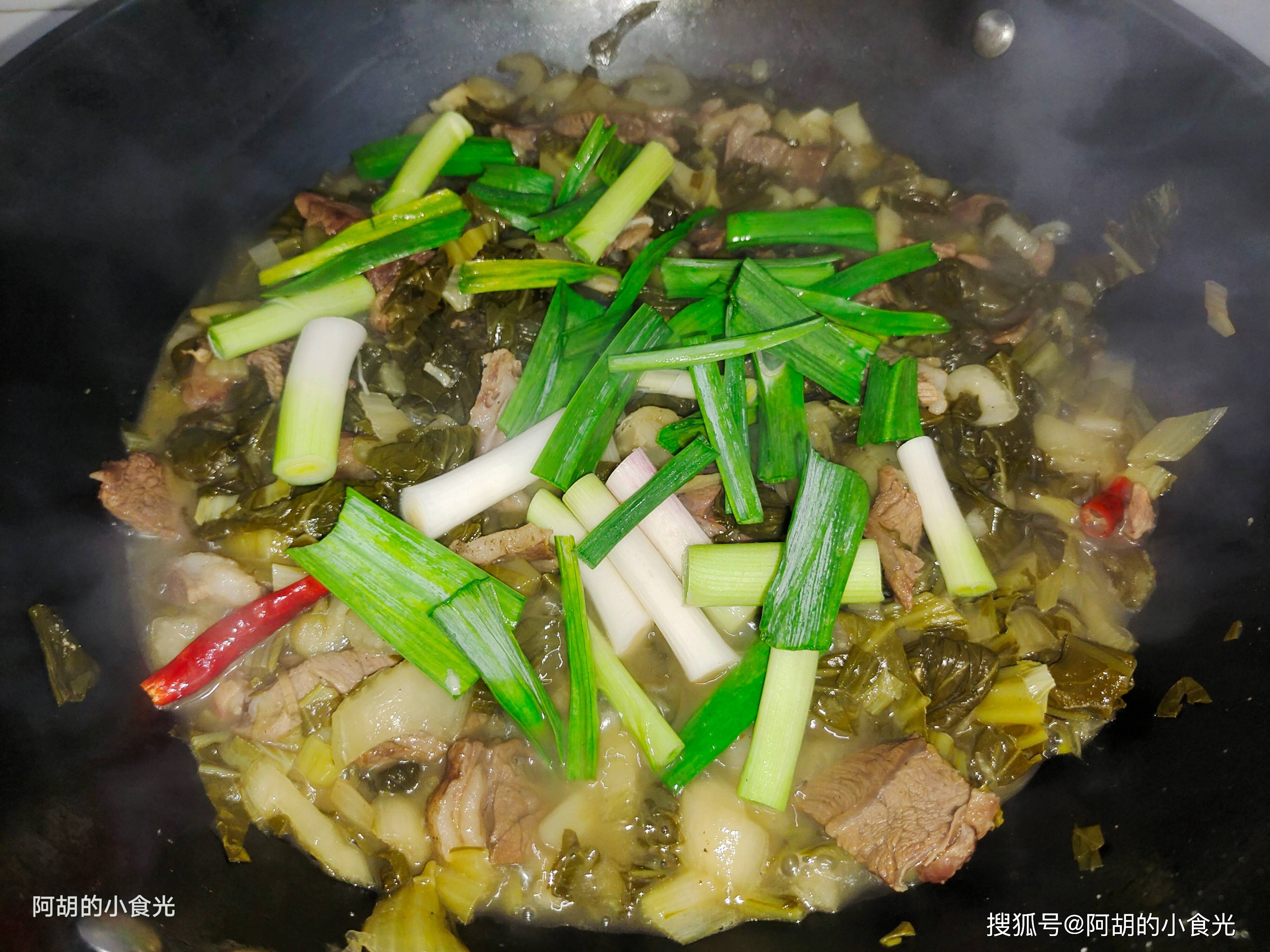 “时间到后就取出青蒜倒入锅中,简单翻炒一下后就可以出锅装盘了。这里建议出锅后直接转入砂锅或者明火锅仔中继续加热,再撒入一些胡椒粉在上面,吃的时候拌一拌即可。上桌还咕嘟咕嘟地冒着热气,酸菜和羊肉的混合香味直冲鼻腔,令人食欲满满。”