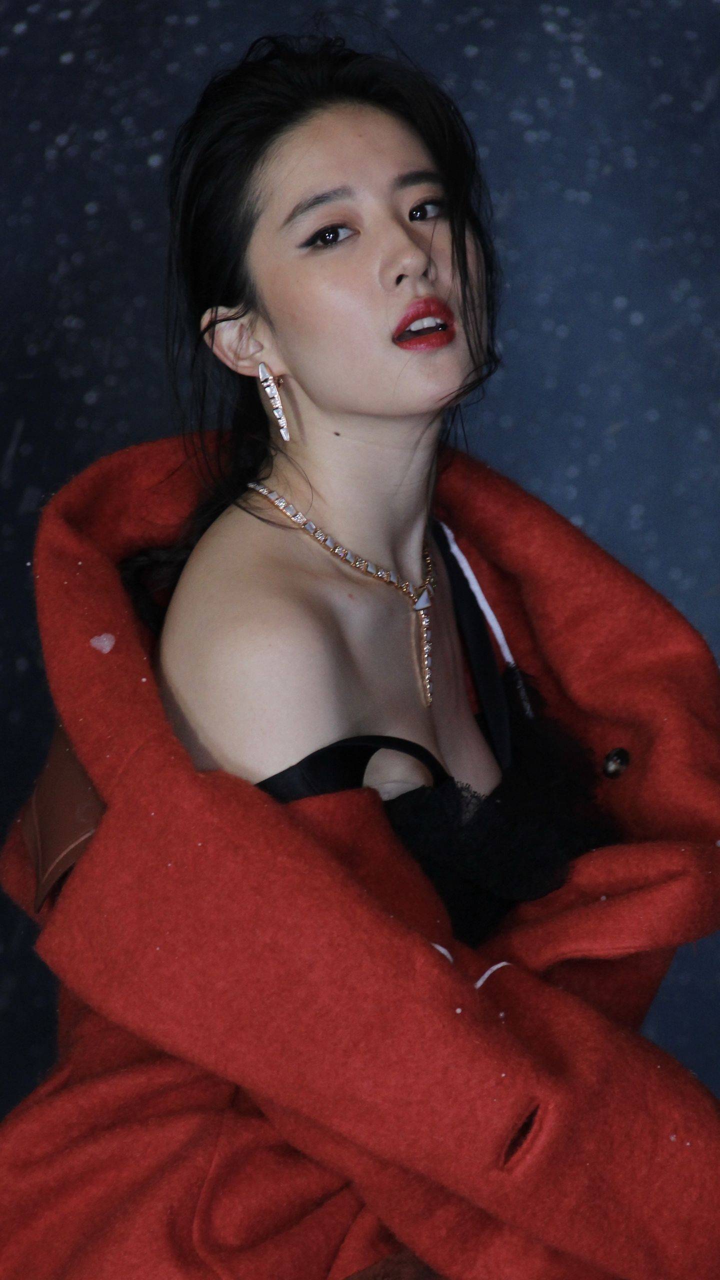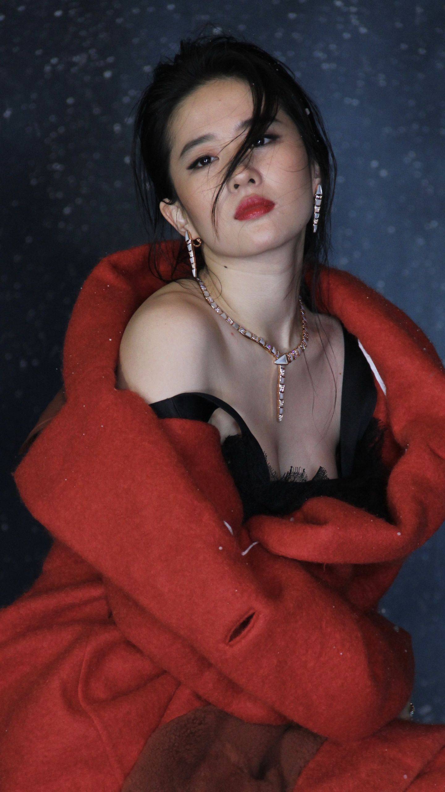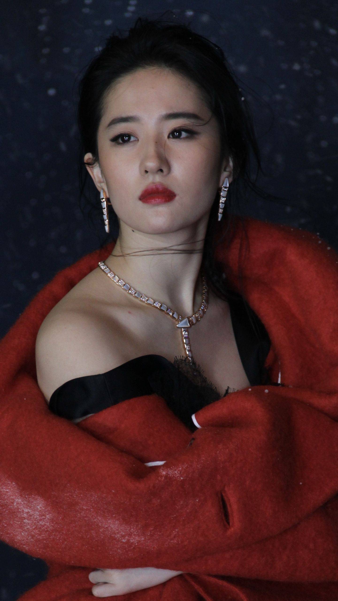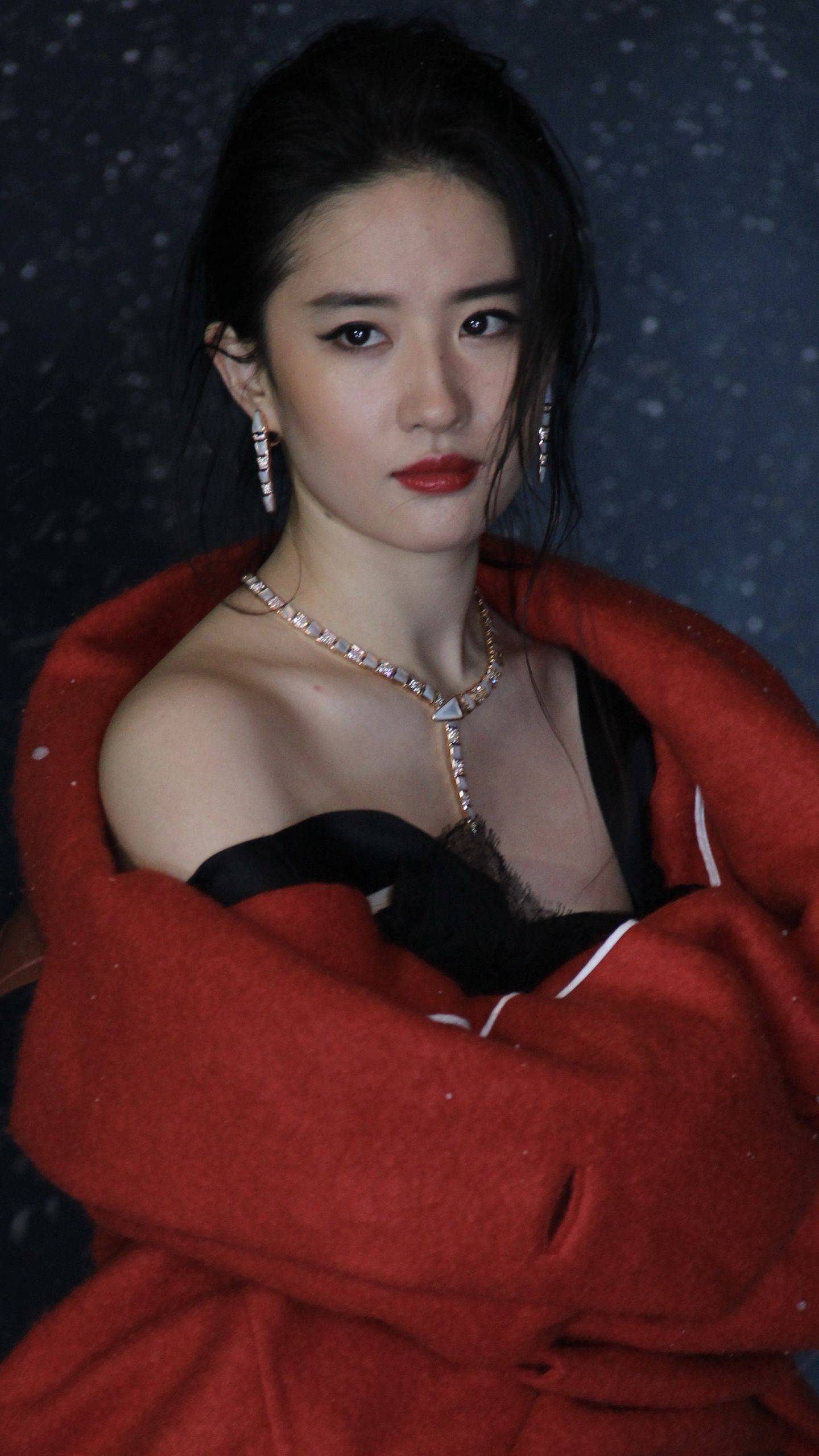 刘亦菲黑色吊带连衣裙红色外套穿搭,身材杀疯了