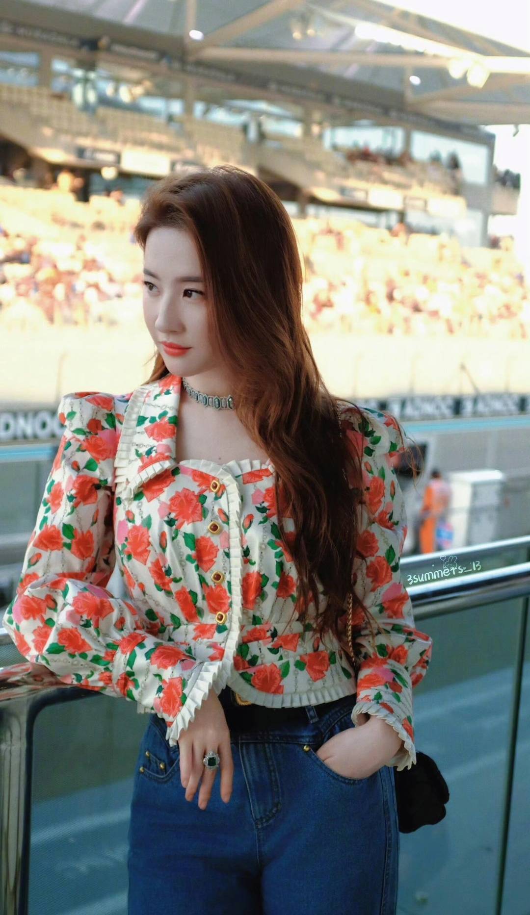 外面那件红色西装外套才是神来之笔!版型是oversize的,但肩线设计得特别妙,既撑得起气场又不会显壮。刘亦菲把袖子随意地卷到手肘,露出半截小臂,肌肉线条紧实又流畅——原来仙女平时没少健身啊!她没扣扣子,让黑色吊带裙若隐若现地露出来,红黑配色经典又高级,像红酒配黑巧克力,浓郁得让人移不开眼。最心机的是她把外套后摆塞进了裙腰,瞬间把腰线提高到胃的位置,这腿长直接突破天际!