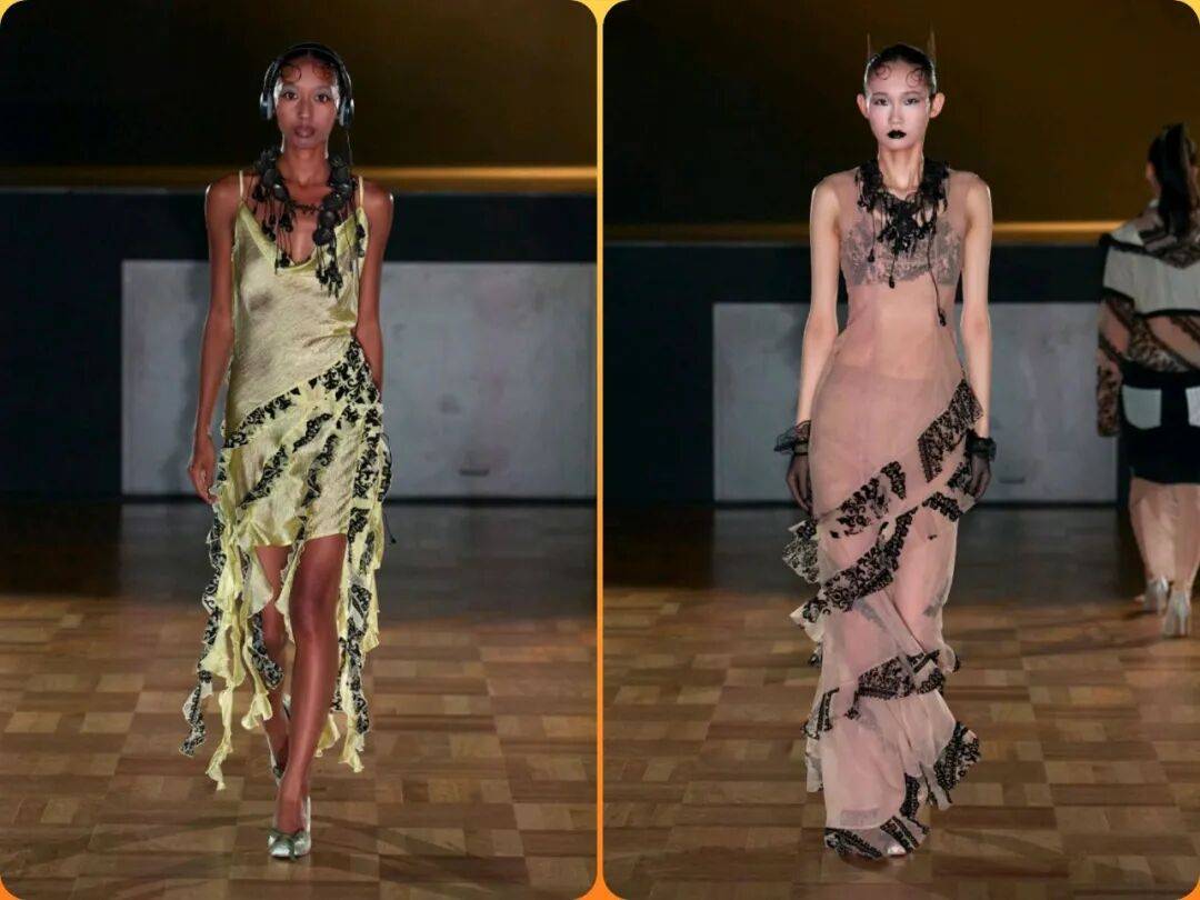 黑色颜色也结合了薄纱的材质,在沉稳的稳重气质也多了一些朦胧隐约的轻盈飘逸感,结合了褶皱元素、镂空设计、花纹图案、露腰等多种设计的出现,为这些服装增加了不少的时尚细节感。