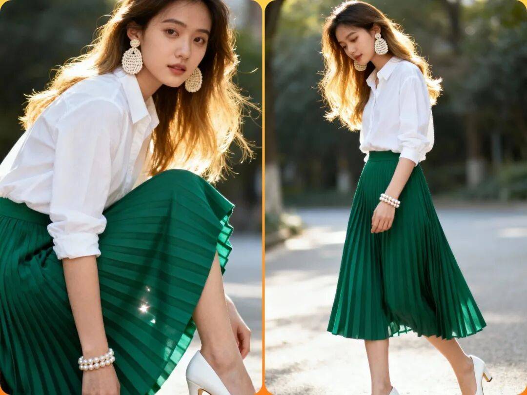 3.翡翠绿的百褶裙搭配基础的白衬衫
