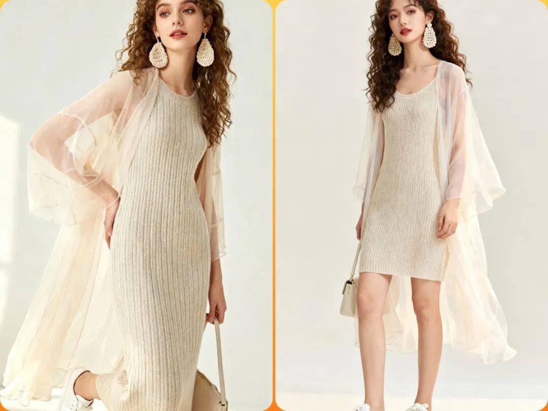 2.用一件轻盈的薄纱外搭在简约的针织连衣裙之外