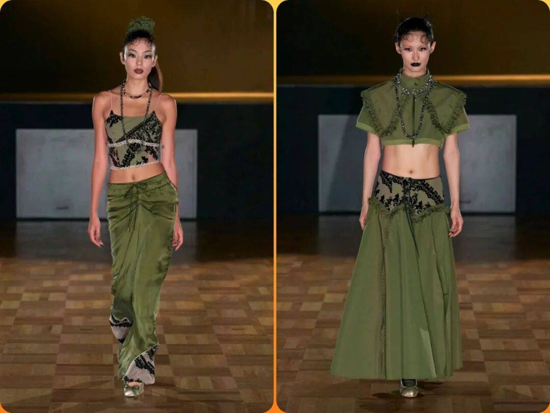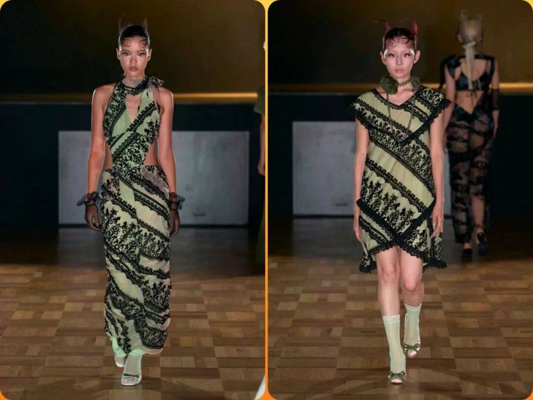 蚕丝提花面料嵌入电路蚀刻纹路,模拟“昆仑玉脉”的矿物结晶;回收电子元件与手工苗绣结合,重现《山海经》“青丘国”的草木图腾,形成赛博部落视觉语汇。