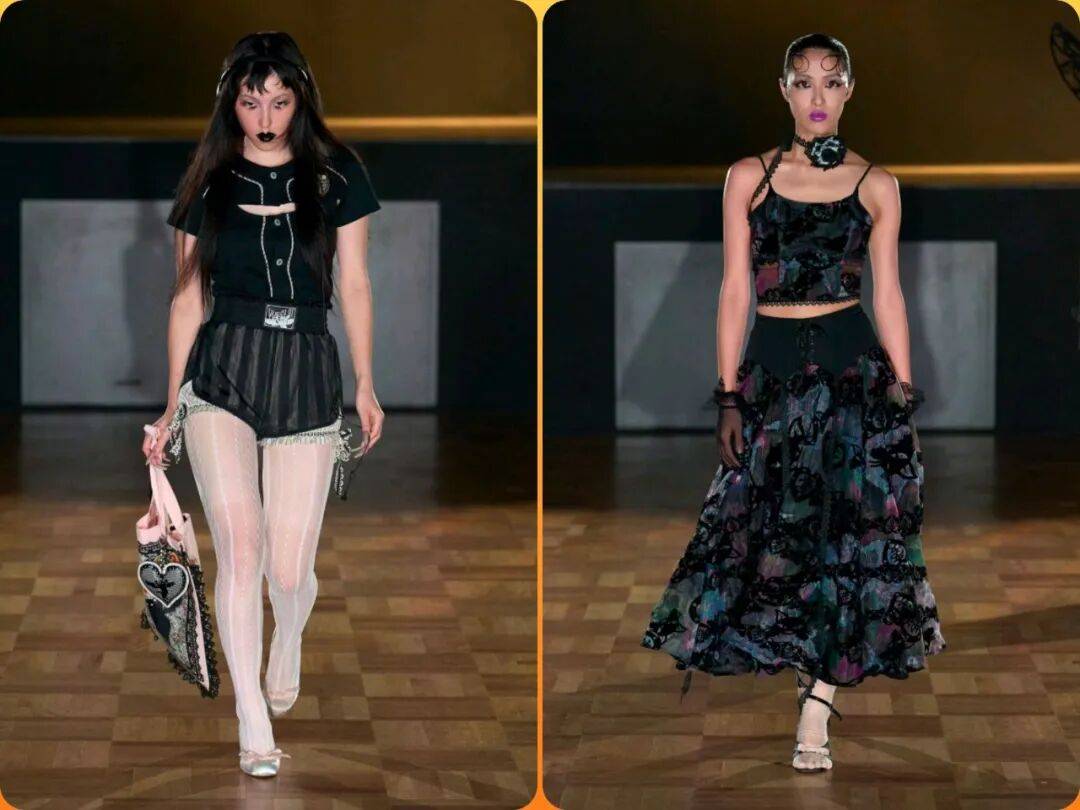 浅色颜色和深色之间的搭配形成了色彩的撞色冲击,色彩的对比增加了图案的活力气质感,也在线条的装饰、露腰设计、堆叠褶皱等设计的出现,让黑色花纹的服装也多了不少的设计感。