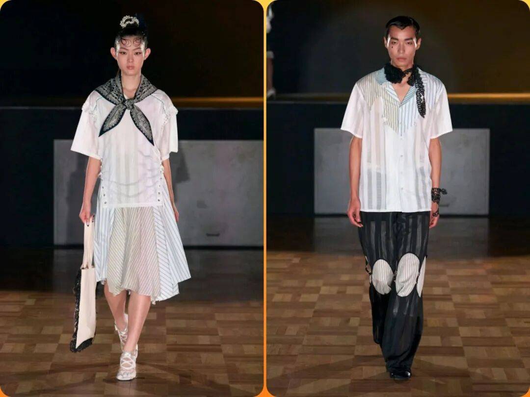 条纹的图案和花纹之间的拼接搭配,在不同配色、不同图案等之间的搭配形成了一些视觉的对比,这些图案在视觉的混搭气质上,也结合了一些拼接、抹胸、夸张衣领等设计的出现,让这些服装增加了不少的细节设计感。