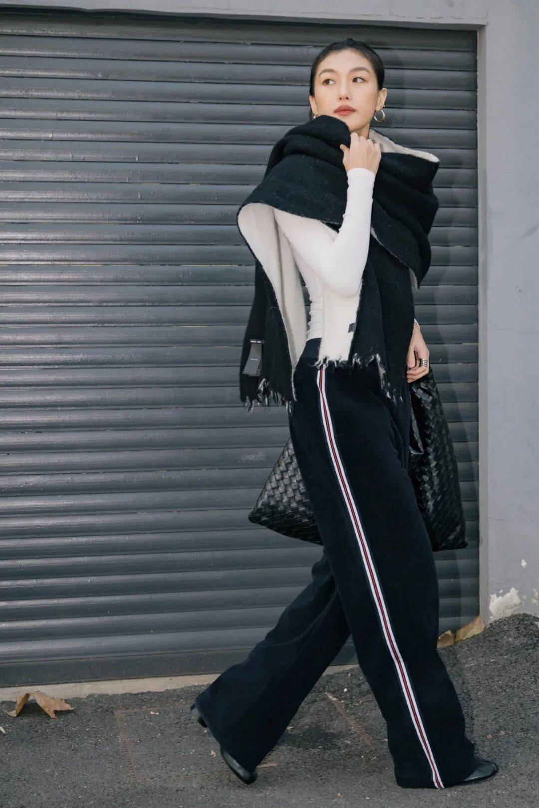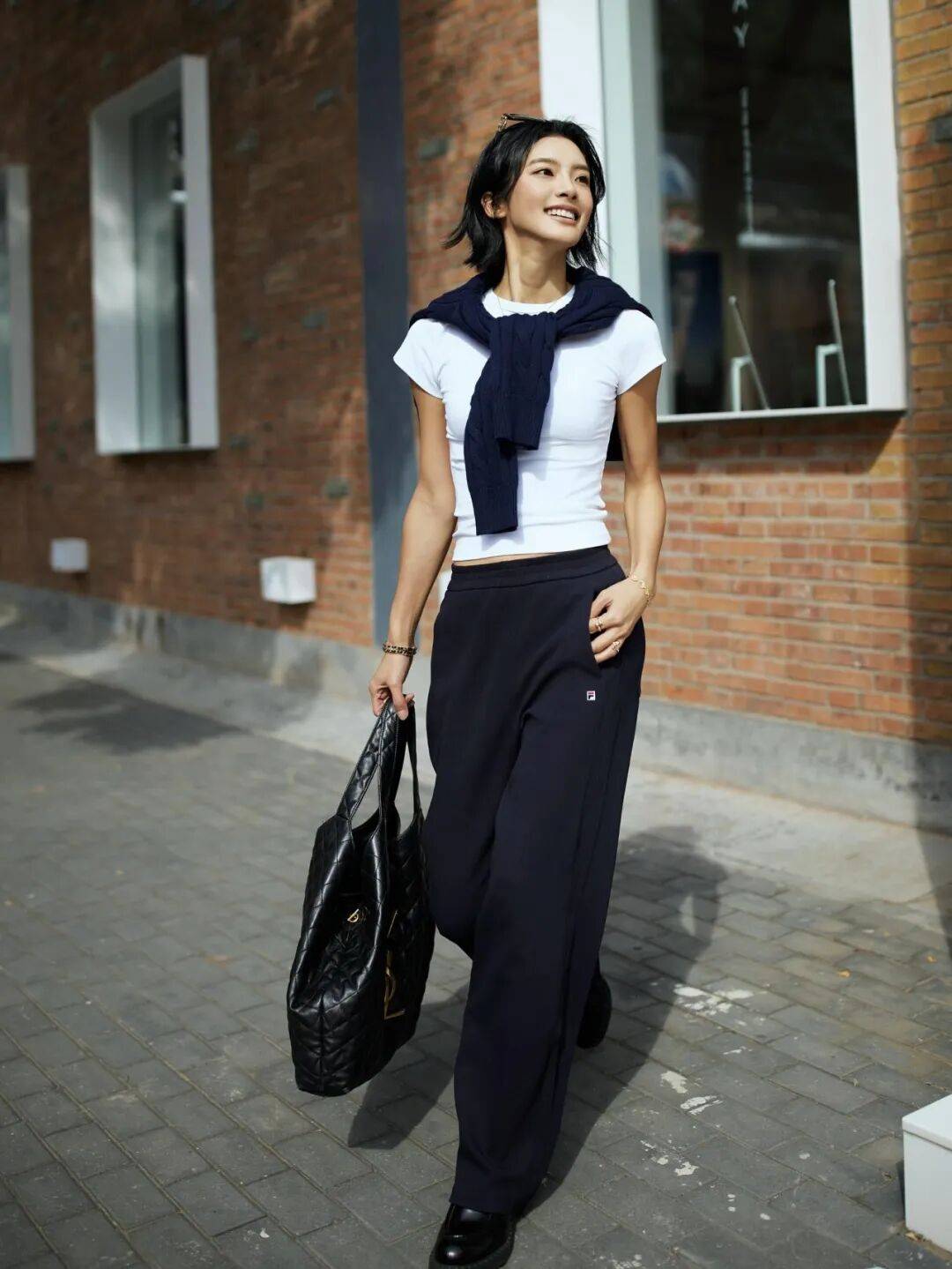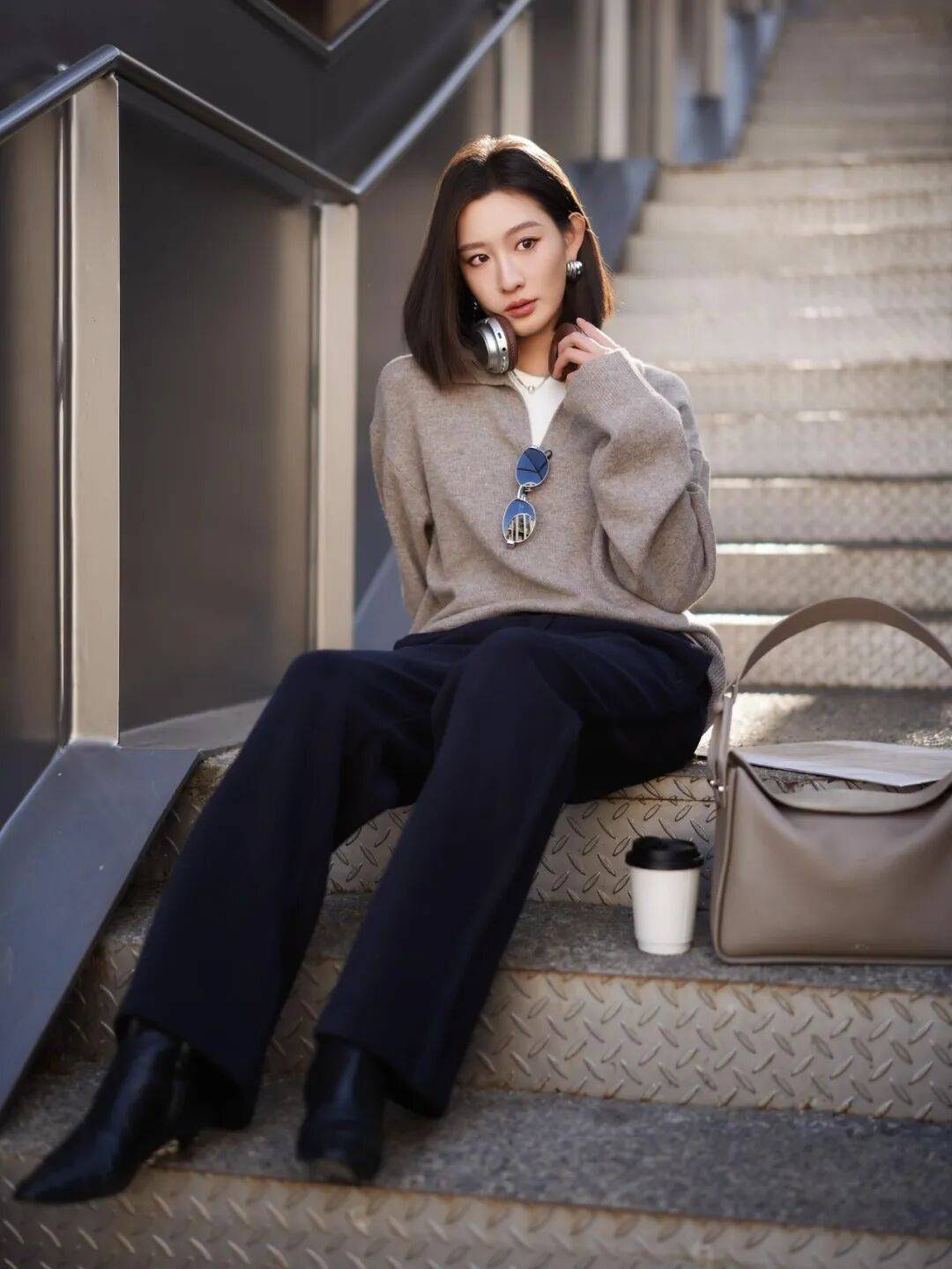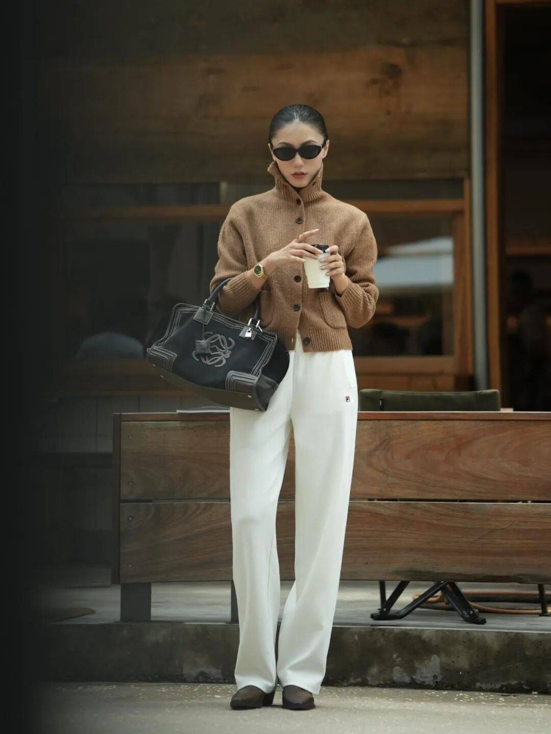 把上衣换成质感、廓形都很好的针织衫,拎上一只皮质包包,越来越多的时髦职场女士也会这么穿。