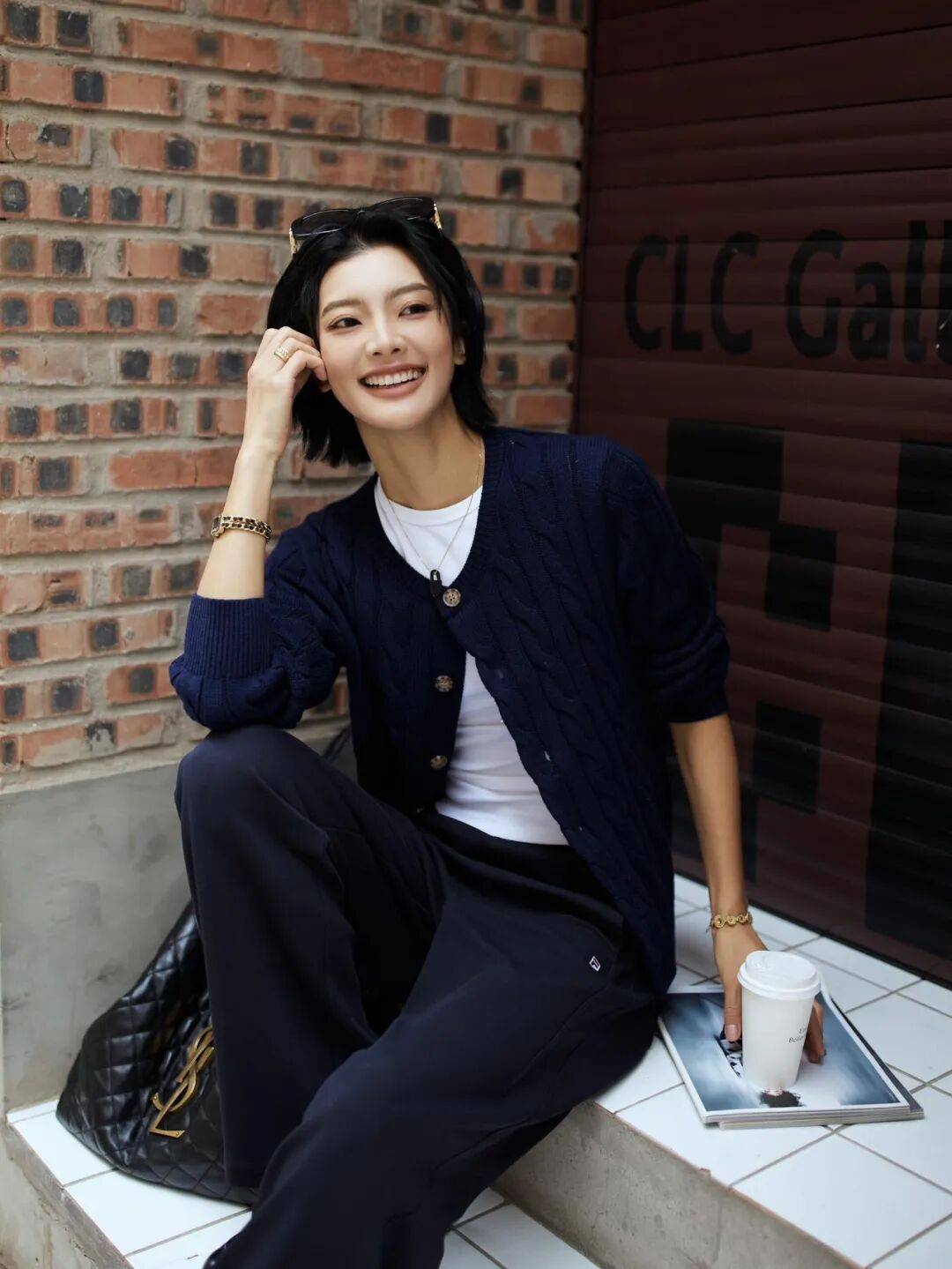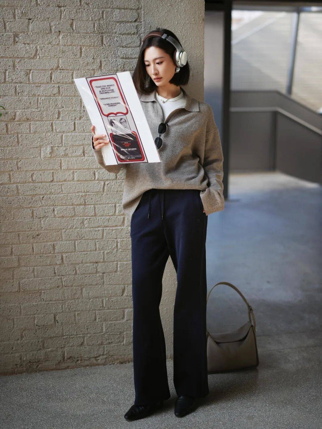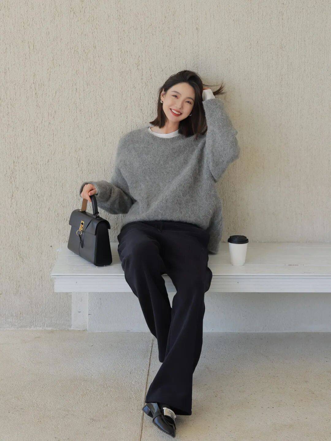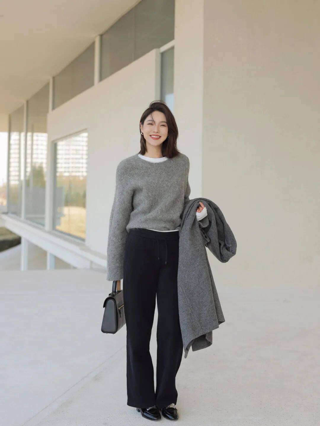 把上衣换成质感、廓形都很好的针织衫,拎上一只皮质包包,越来越多的时髦职场女士也会这么穿。