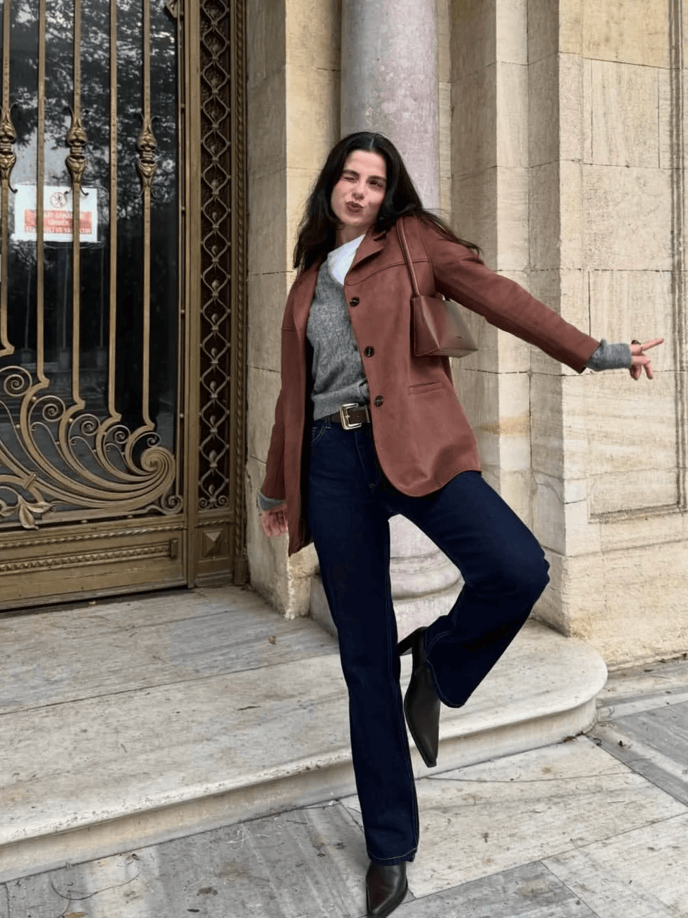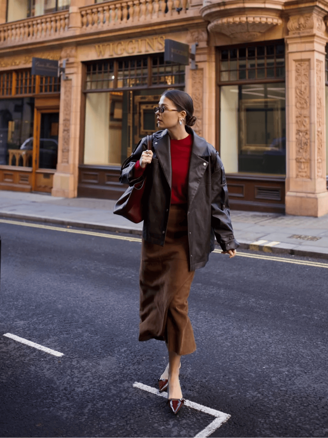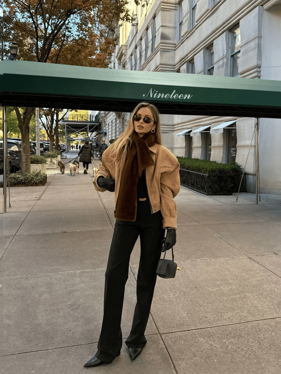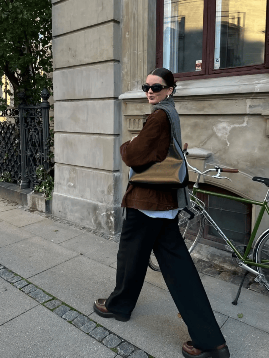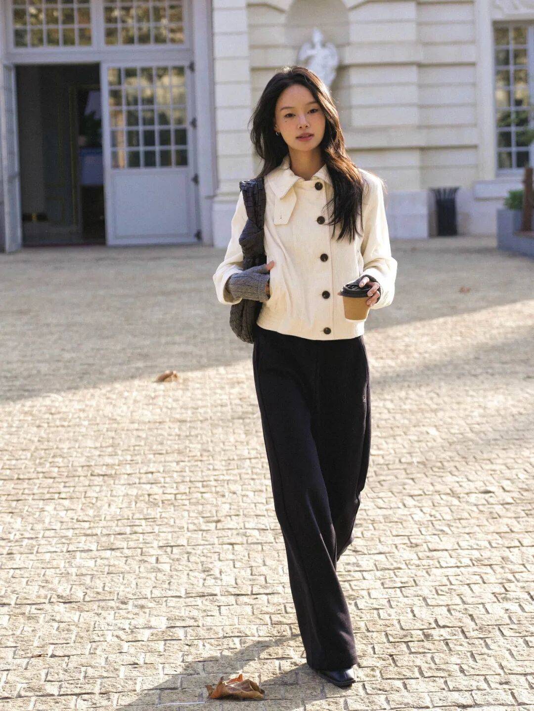 复古感十足的咖色夹克搭配线条利落的黑色阔腿裤,能明确腰线,拉长腿部线条,塑造出优越的身材比例。