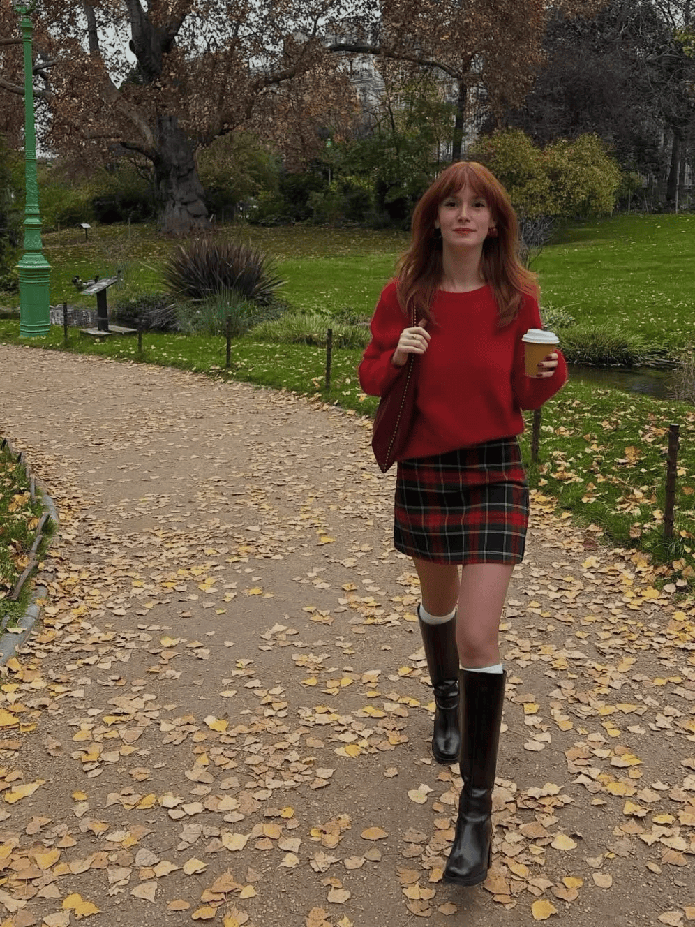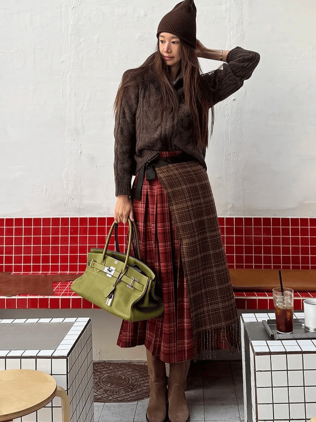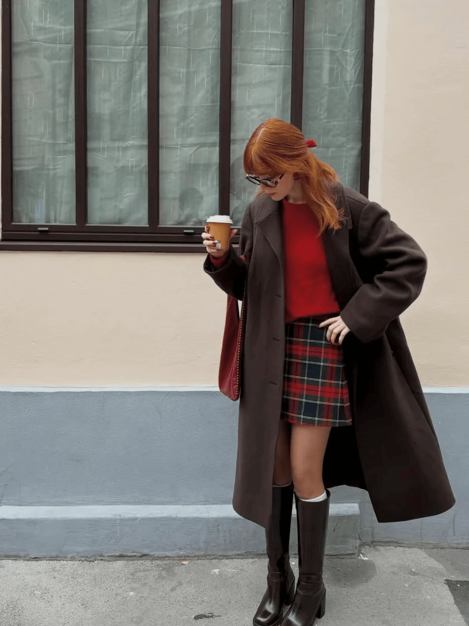 红色与棕色同属暖调,搭配起来天生和谐。红色毛衣+红色格子短裙+红色腋下包+黑色膝下靴,外穿时就很好看。外搭一件咖色长大衣,长短错落有致,好看又保暖。