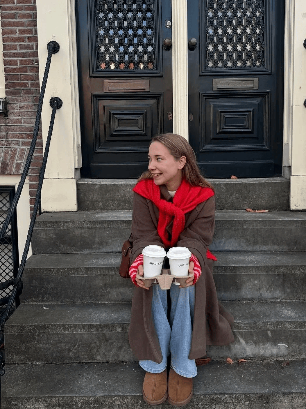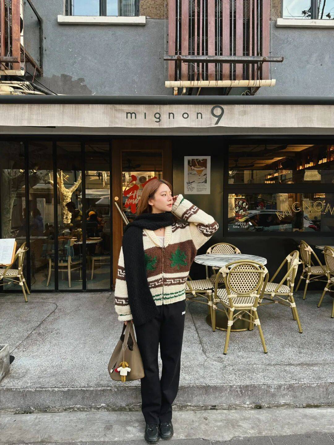 穿棕色咖色外套时,一抹恰到好处的红色,便是打破沉寂、瞬间点燃造型灵魂的点睛之笔。比如戴一条红色针织三角巾,套一双红色手套。
