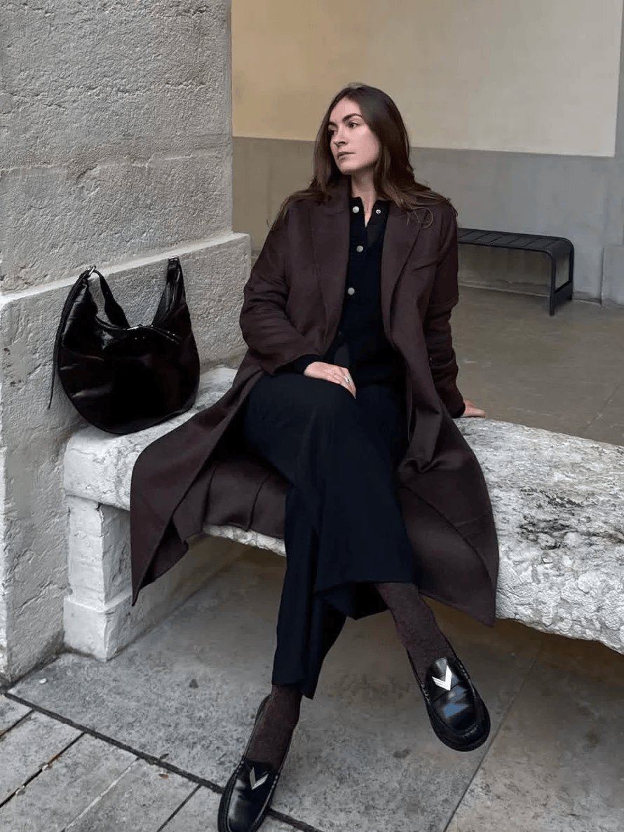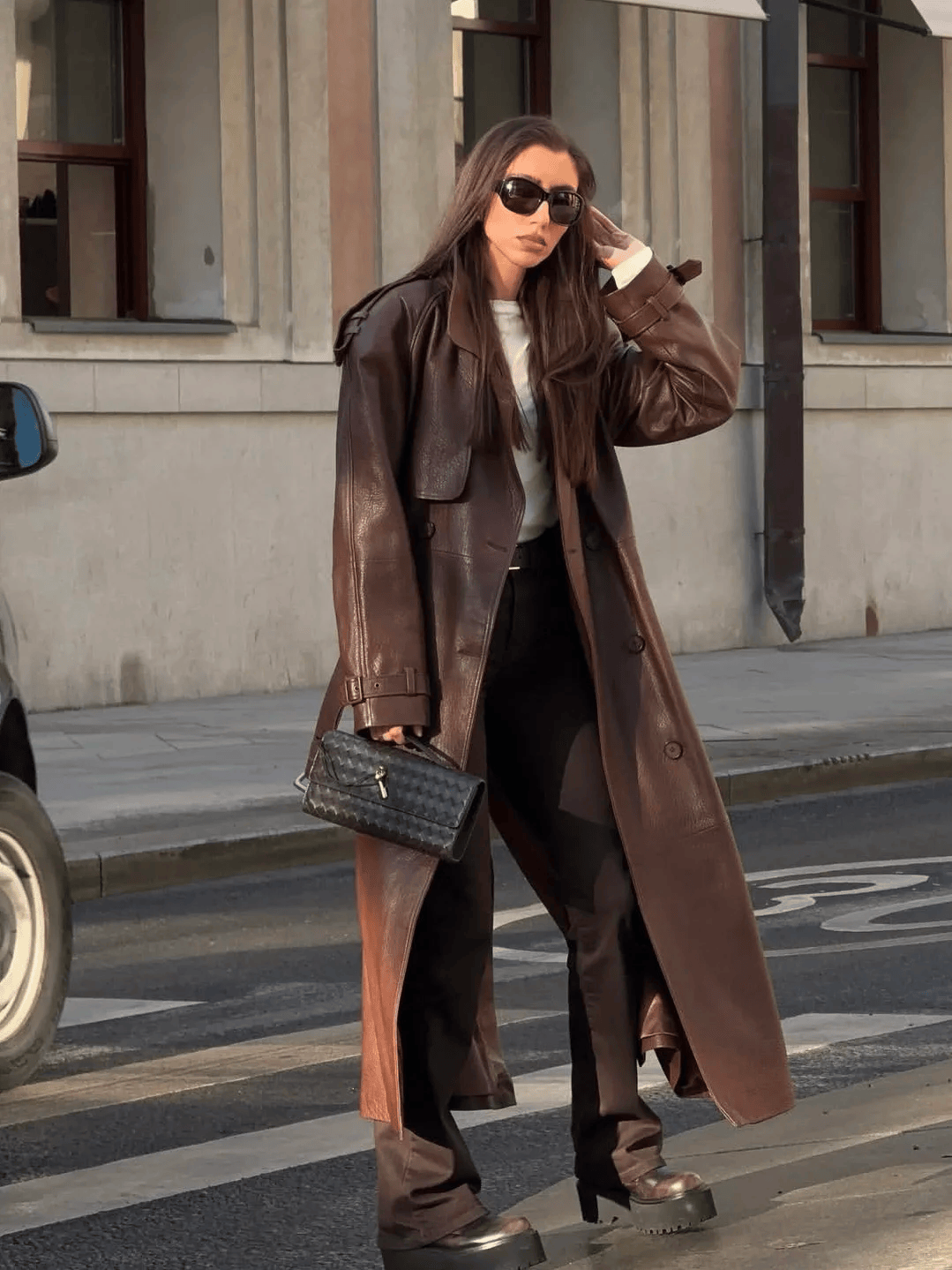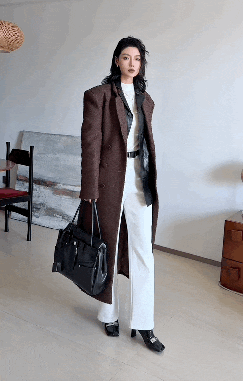 给棕色麂皮大衣搭配灰色高领毛衣,麂皮材质特有的绒面质感与温暖色调,仿佛自带冬日暖阳的滤镜,下装搭配灰色阔腿裤,流畅垂坠的线条不仅修饰腿型,更与上衣形成和谐的同色系叠穿。