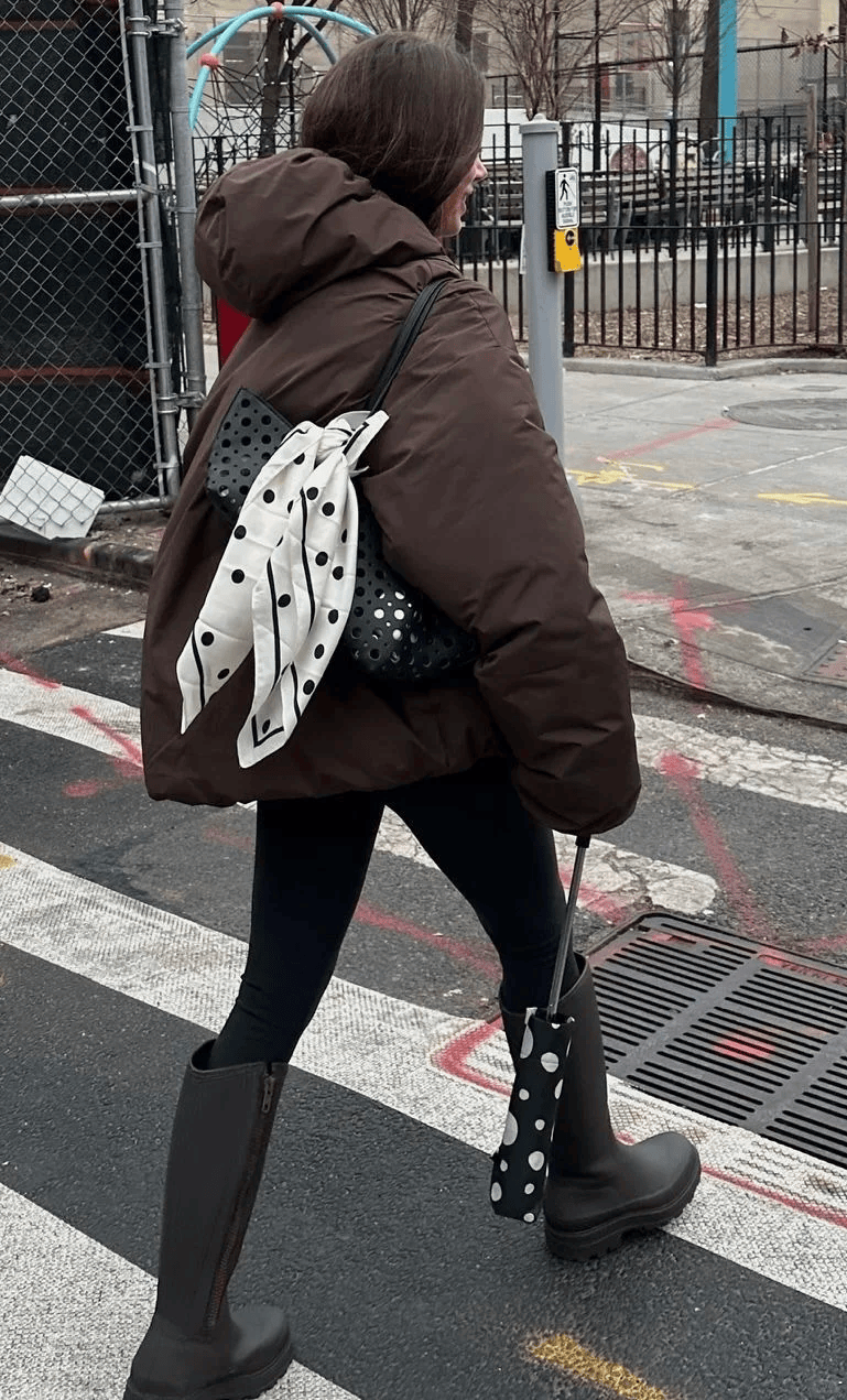 配黑色膝下靴时,就可以选择毕竟贴身的小黑裤,比如鲨鱼裤、瑜伽裤,有一种运动的美感。