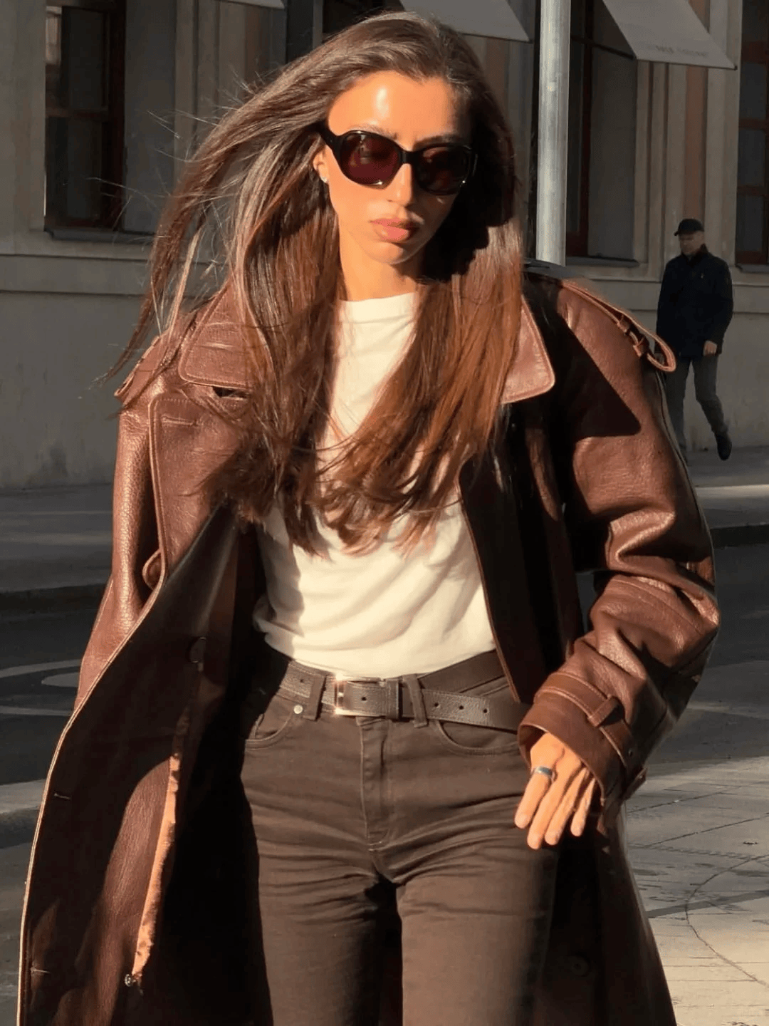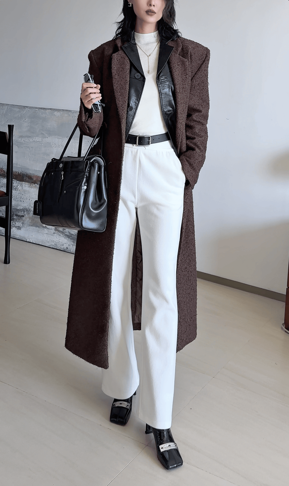 白色系内搭的清爽打破咖色的沉闷感,显得愈发高级,既衬肤色又显气质,下身的裤子可以选择大地色系的,和外套呼应起来,也可以选择小黑裤打安全牌。