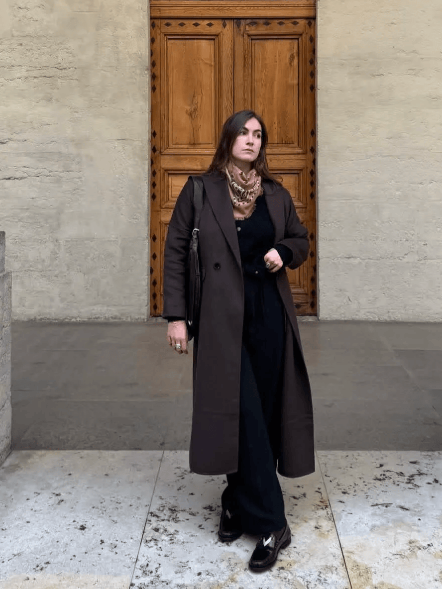 搭配黑色阔腿裤,很适合上班通勤穿,内搭就挑黑色打底衫,可以像博主这样配一条棕色系印花丝巾来增加亮点。