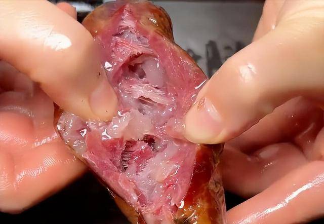 含过量保水剂的肉一按一个坑,半天弹不回来,像按在注水海绵上,切开更露怯,横截面光滑无撕裂感,吃着嫩得离谱却没嚼劲,像嚼带牛肉味的果冻。