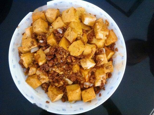 材料:北豆腐1块、猪肉100克、油盐适量、葱1段、姜2片、大蒜2瓣、郫县豆瓣酱1汤匙、酱油1汤匙、料酒1汤匙、水淀粉适量、