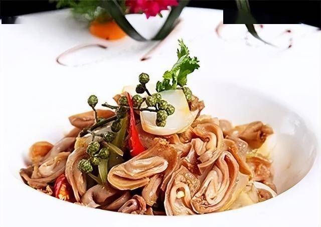 4、把泡入味的石斑鱼肚摆在上面,最后点缀红小米辣节、芹菜叶、炸香的鲜青花椒,即成。