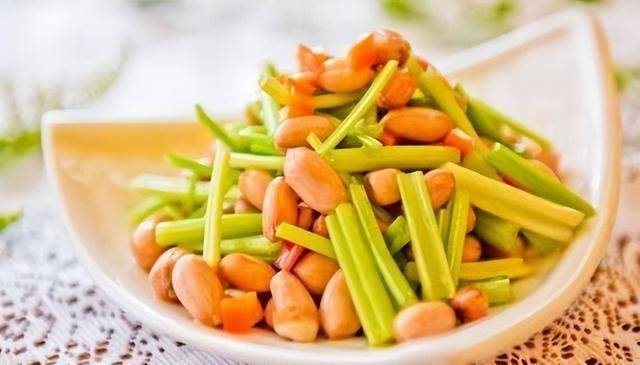 6、将腌制好的芹菜,沥掉水分,放入放凉的花生米,淋入亚麻籽油拌匀。