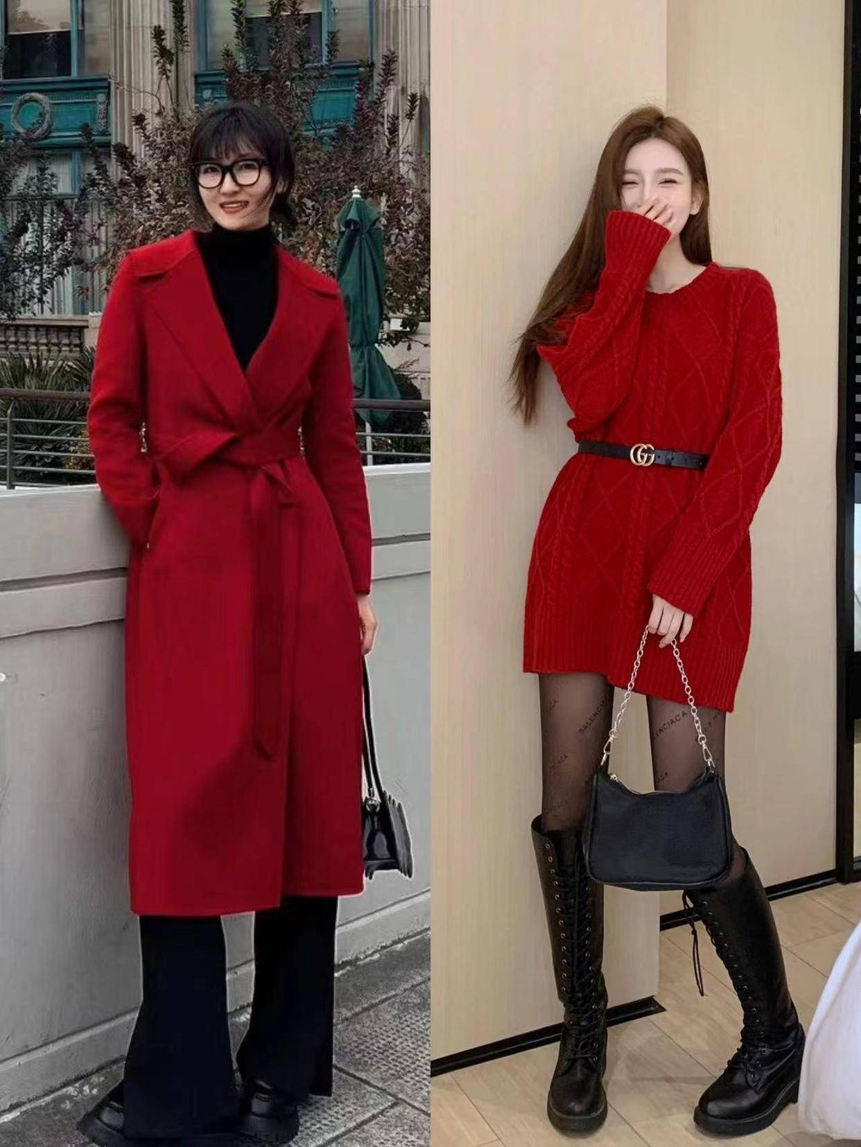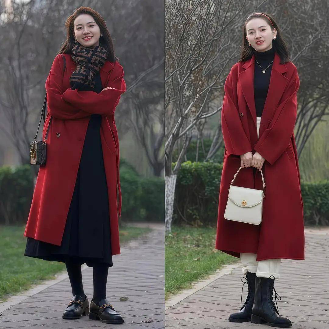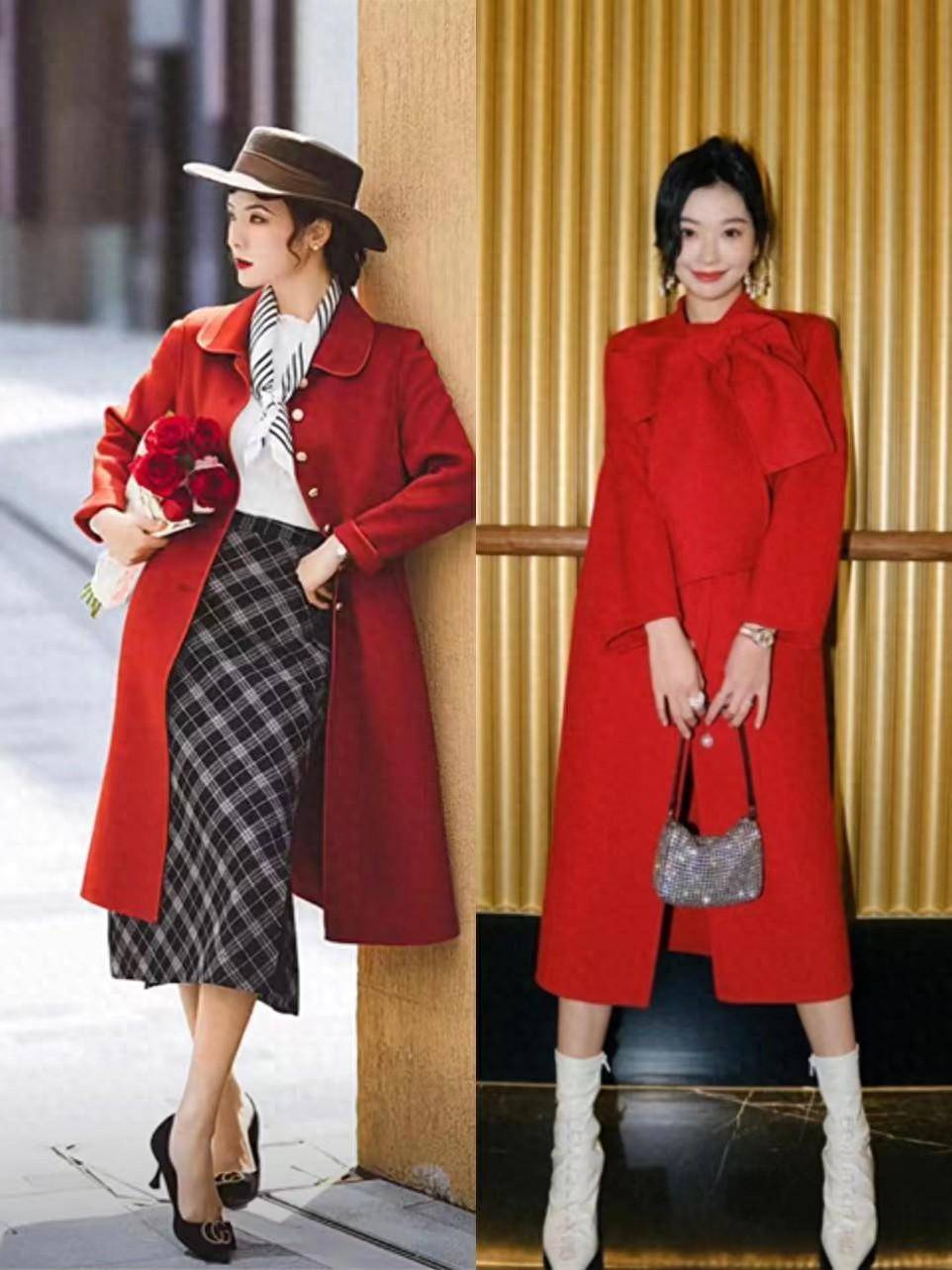 长款:偏酒红色或安可拉红,垂坠感好的羊毛/羊绒面料,内搭黑白灰简约单品(如黑色高领打底衫+黑色阔腿裤),大气高级,适合正式场合或年底聚会。