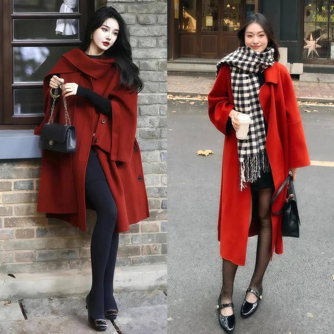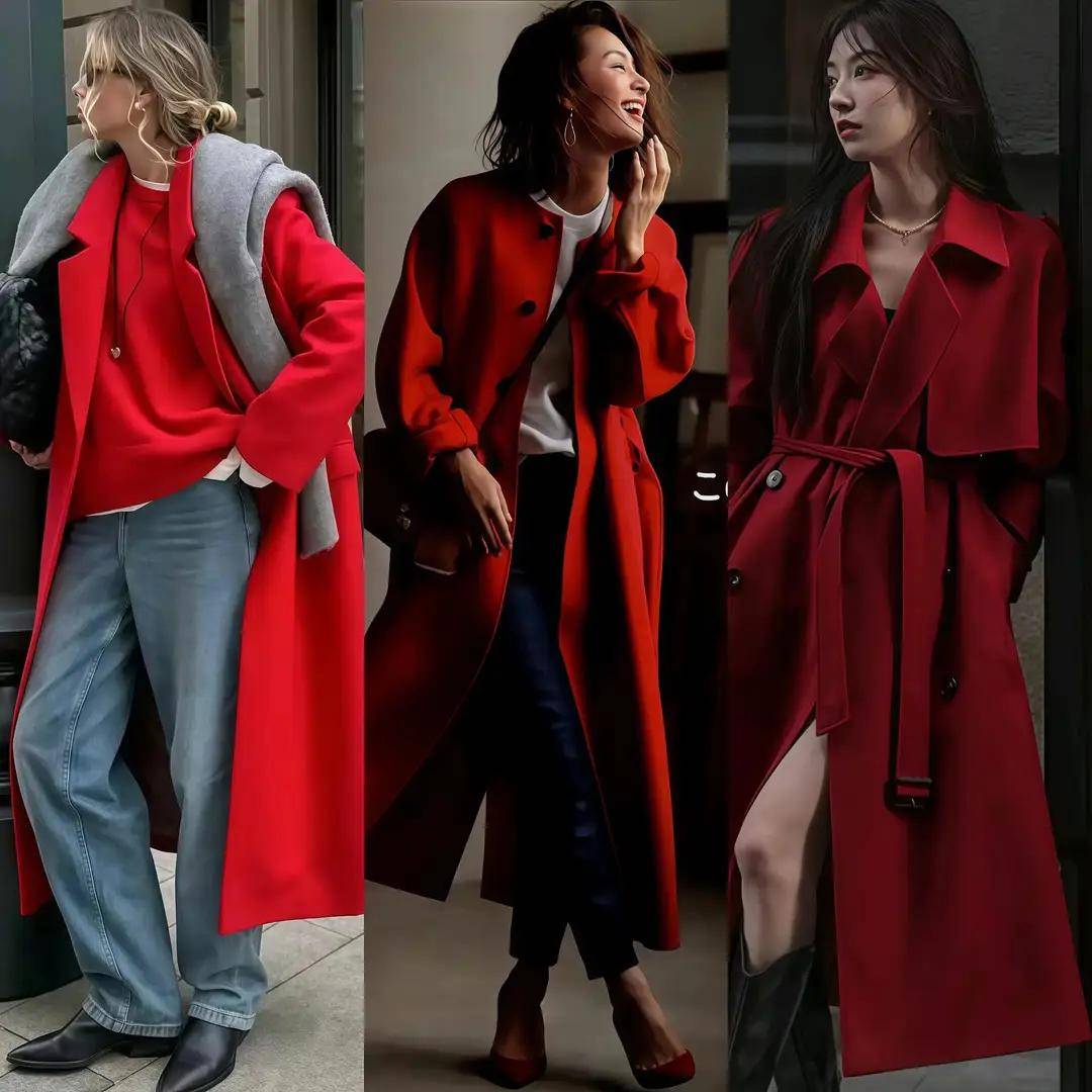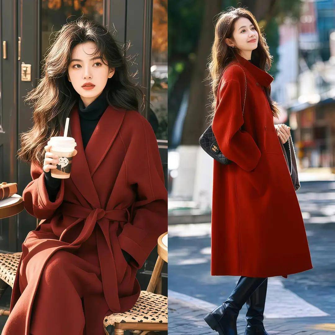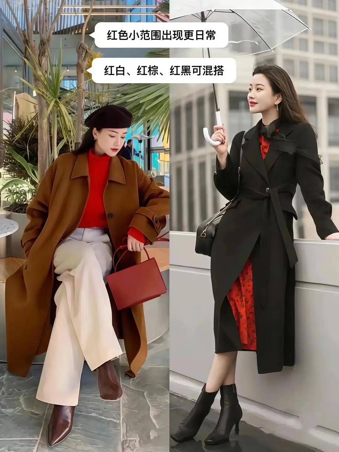 长款:偏酒红色或安可拉红,垂坠感好的羊毛/羊绒面料,内搭黑白灰简约单品(如黑色高领打底衫+黑色阔腿裤),大气高级,适合正式场合或年底聚会。
