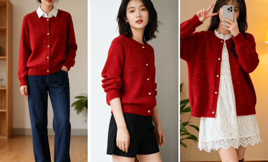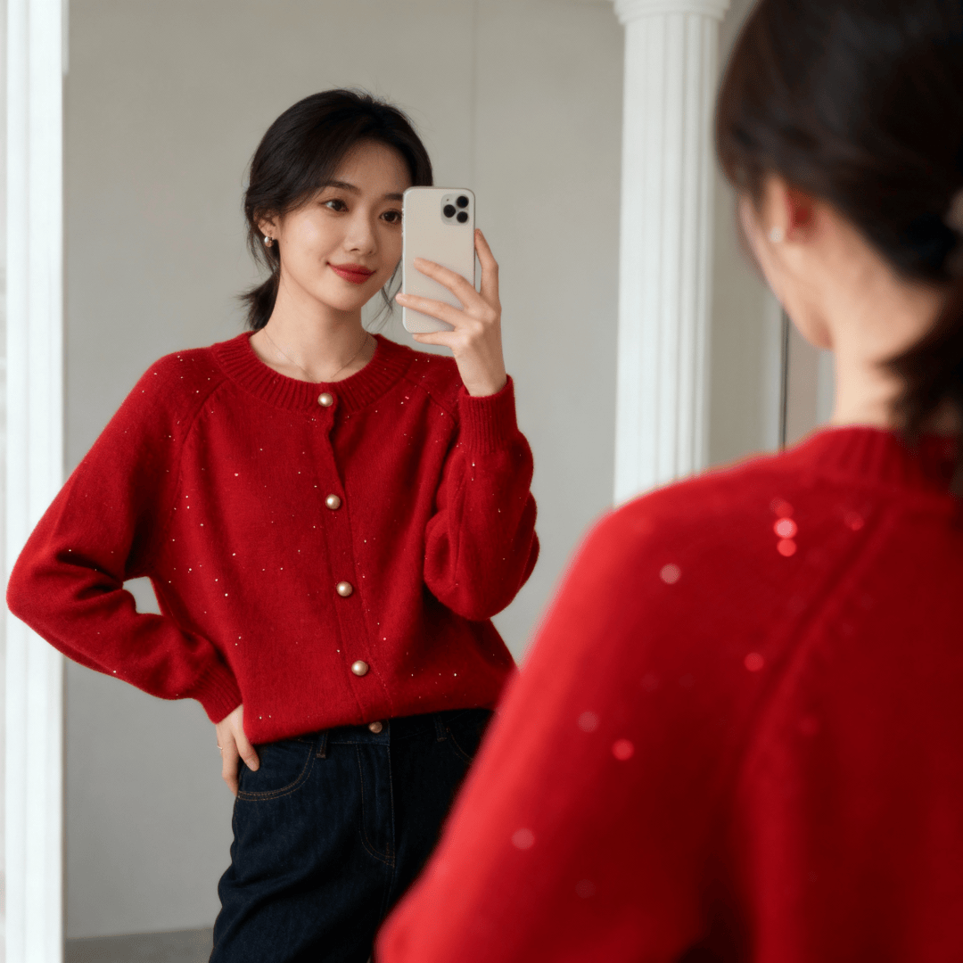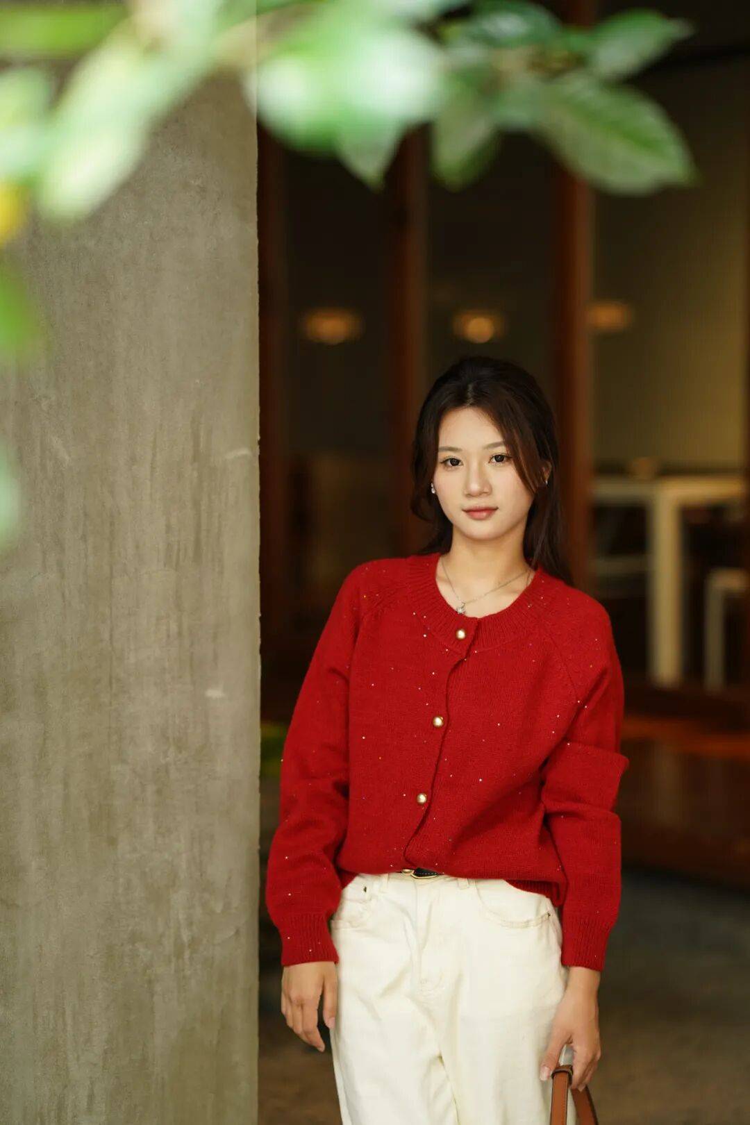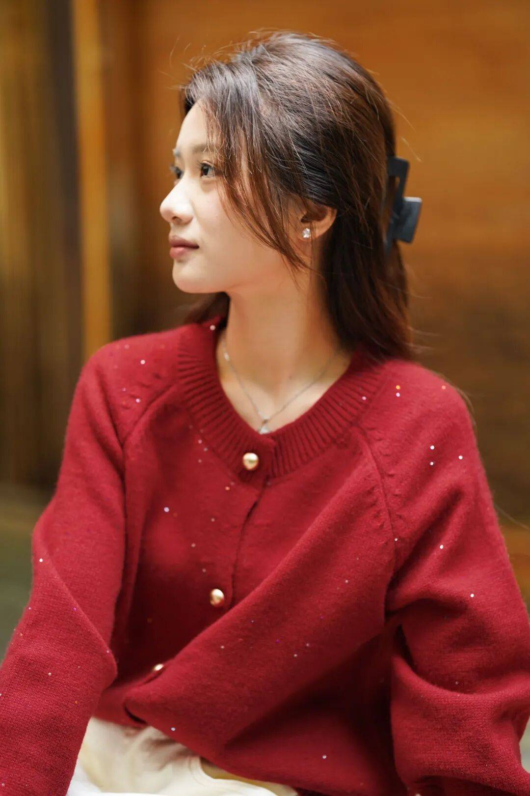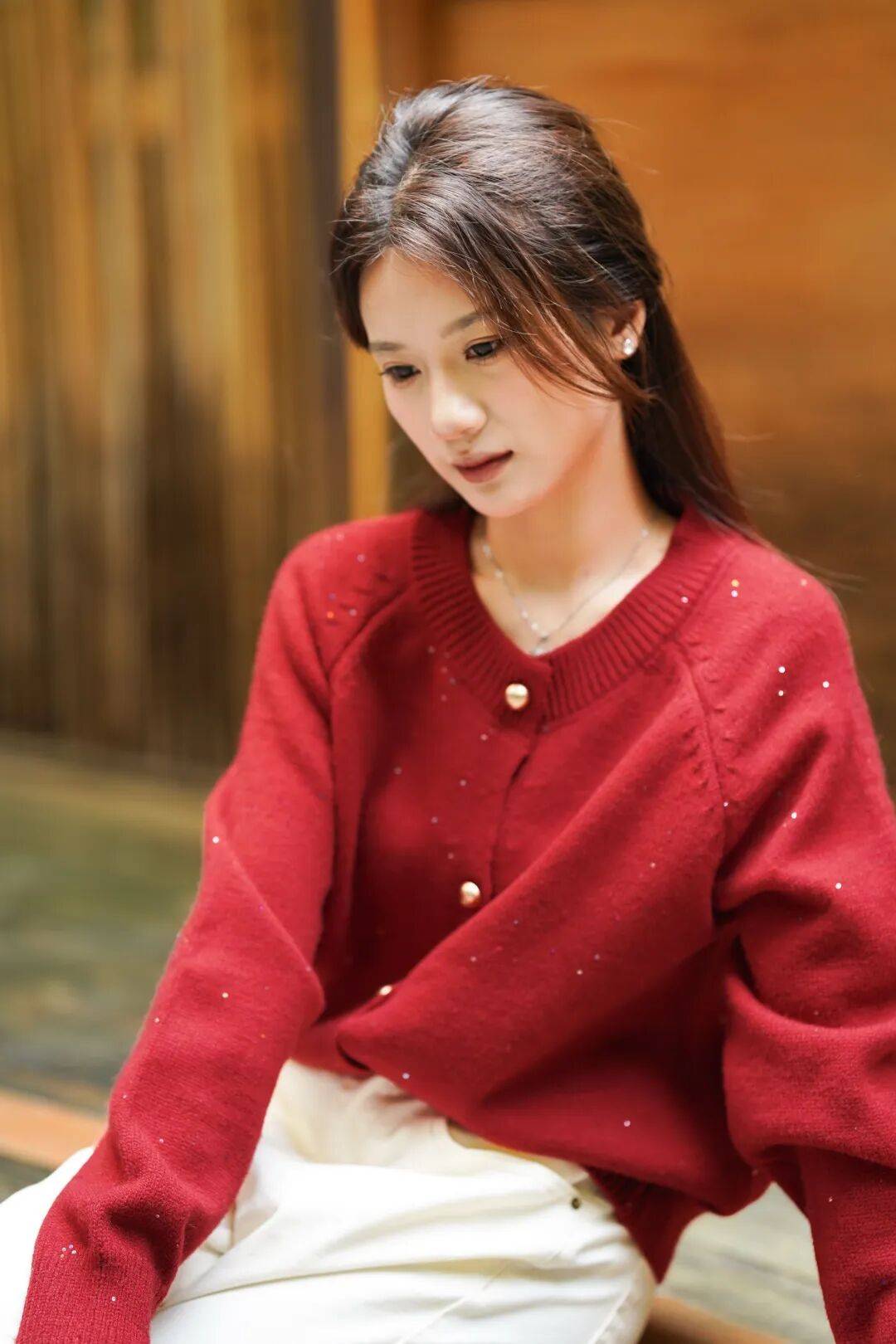 软糯的混纺材质(如羊毛+桑蚕丝),圆领或V领设计,可单穿(搭配牛仔裤/半裙)、内搭(穿在大衣里露出领口)或当披肩(披在肩膀上),既有过年氛围感,又不过于张扬,适合不想大面积穿红色的人。