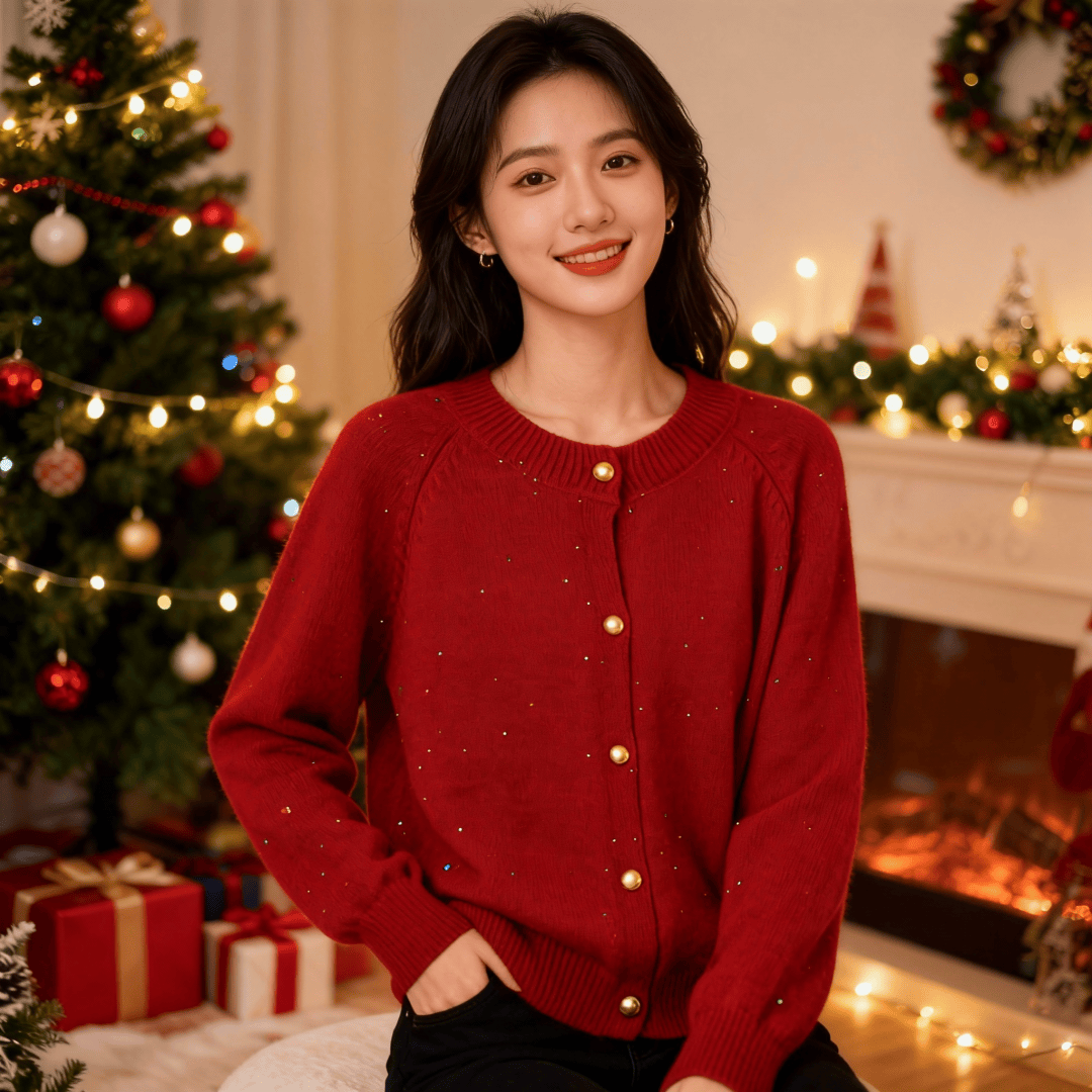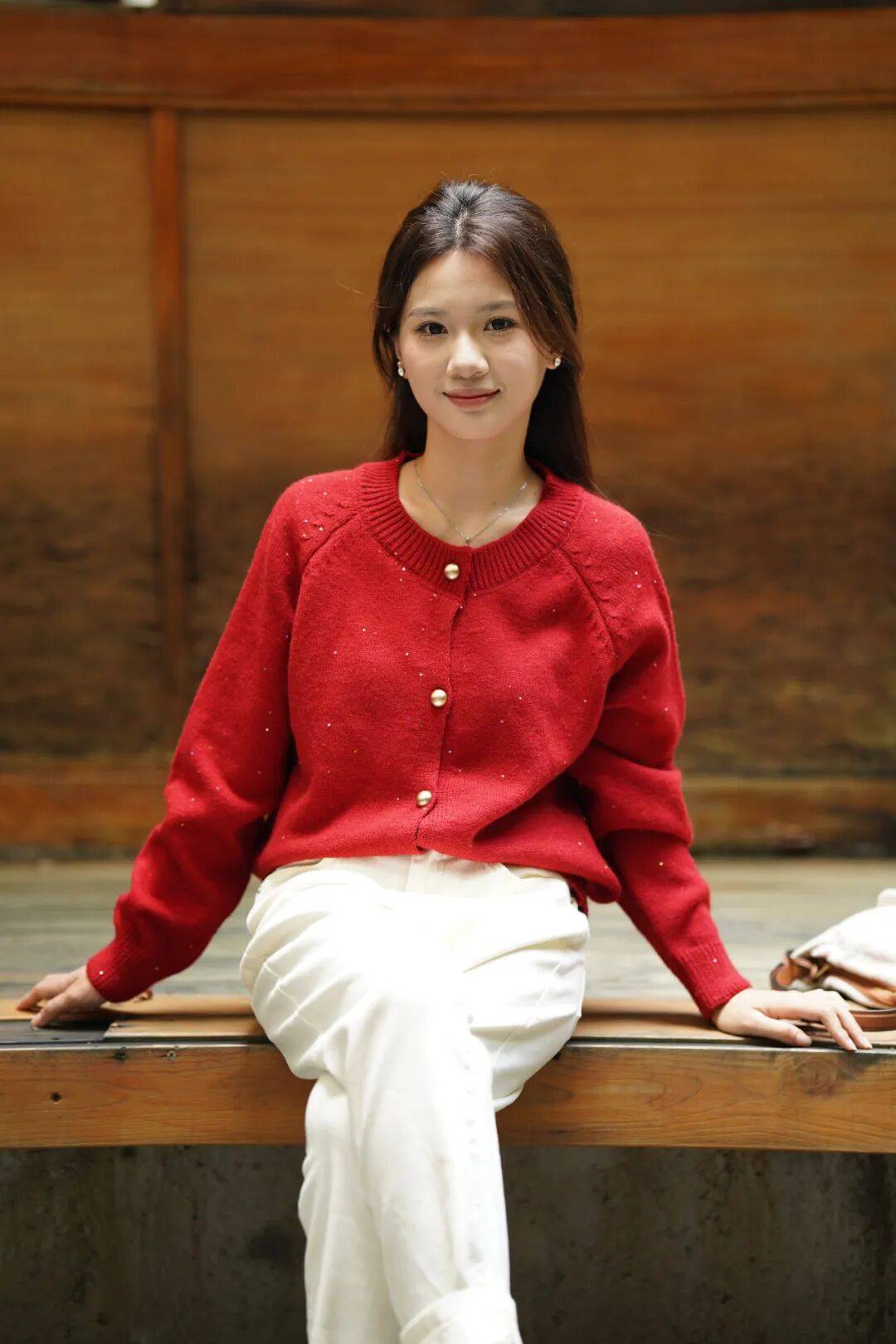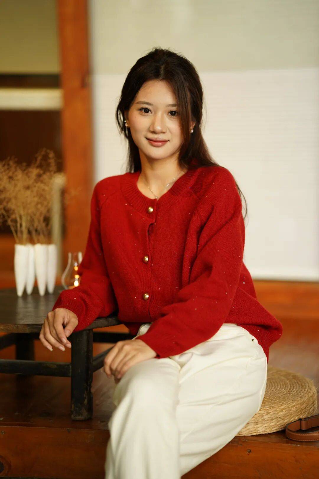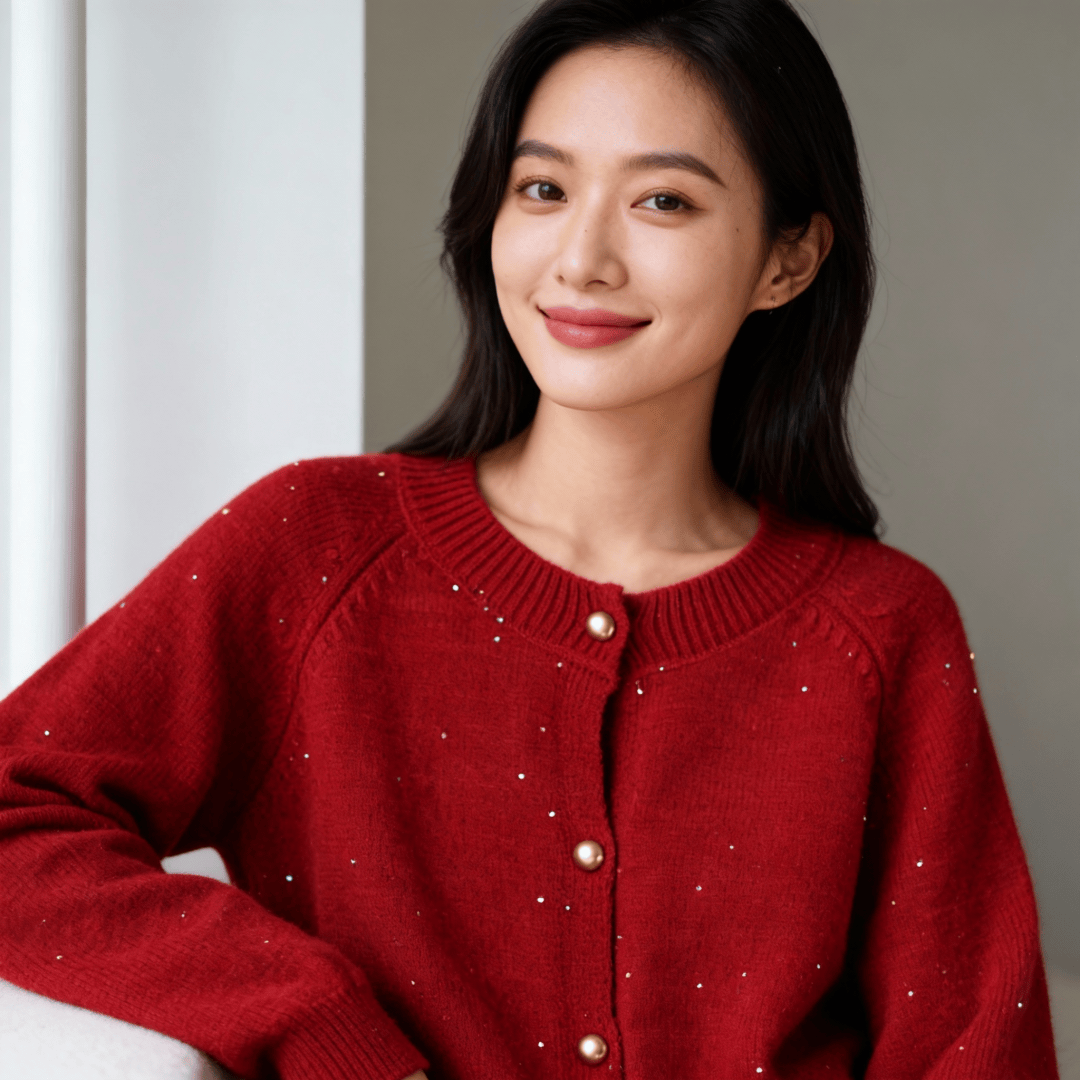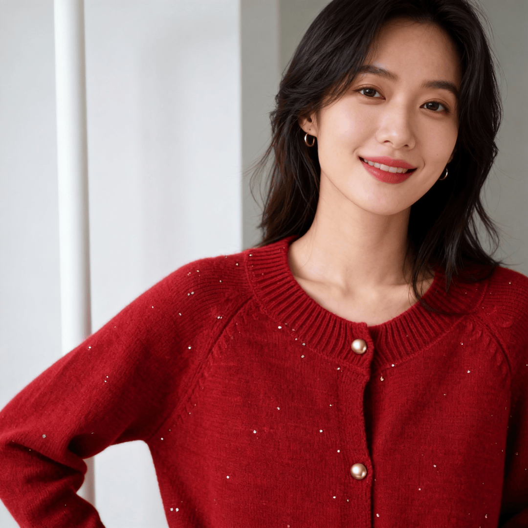 软糯的混纺材质(如羊毛+桑蚕丝),圆领或V领设计,可单穿(搭配牛仔裤/半裙)、内搭(穿在大衣里露出领口)或当披肩(披在肩膀上),既有过年氛围感,又不过于张扬,适合不想大面积穿红色的人。