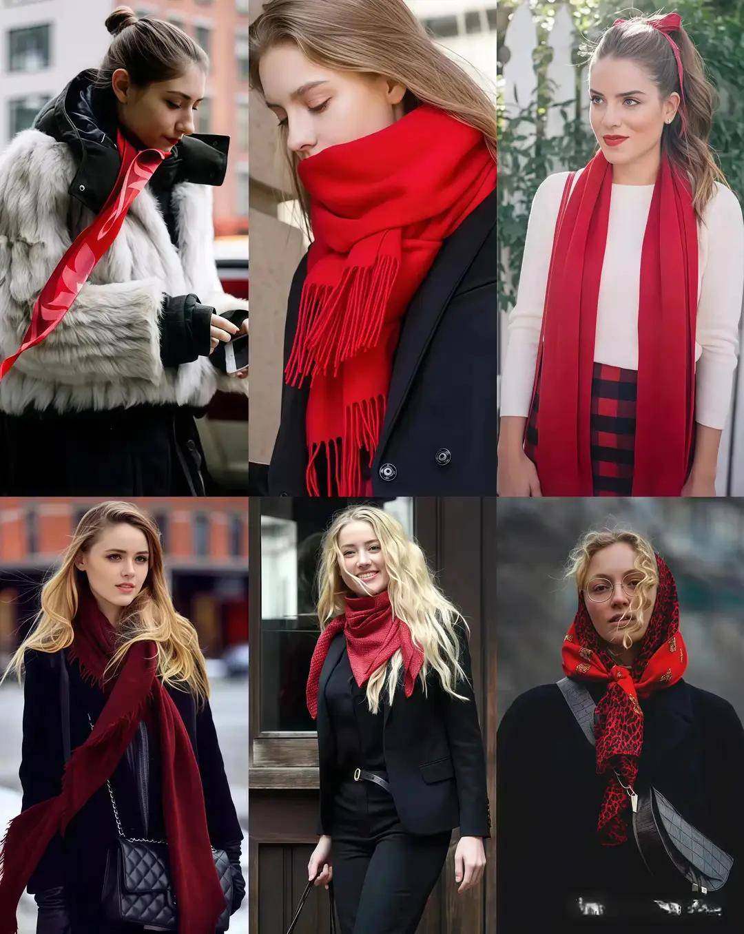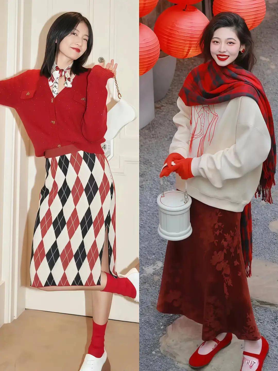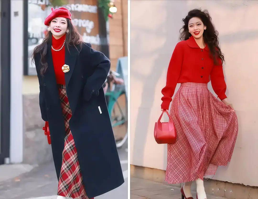 围巾、包包、鞋子、袜子等小面积点缀,如红色皮质手袋(光滑小牛皮或麂皮)、红色靴子(复古玛丽珍鞋或短靴)、红色围巾(格子或纯色),能瞬间点亮造型,既有喜庆感又不夸张。