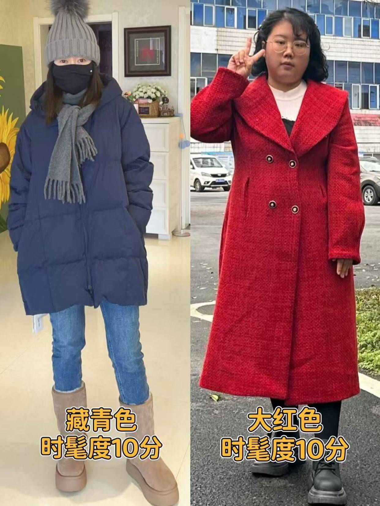 柔和的红色(如安可拉红),填充90%白鸭绒,保暖又喜庆,搭配黑色直筒裤+黑色毛衣,整个人看起来年轻有活力,适合冬天走亲访友或户外游玩。