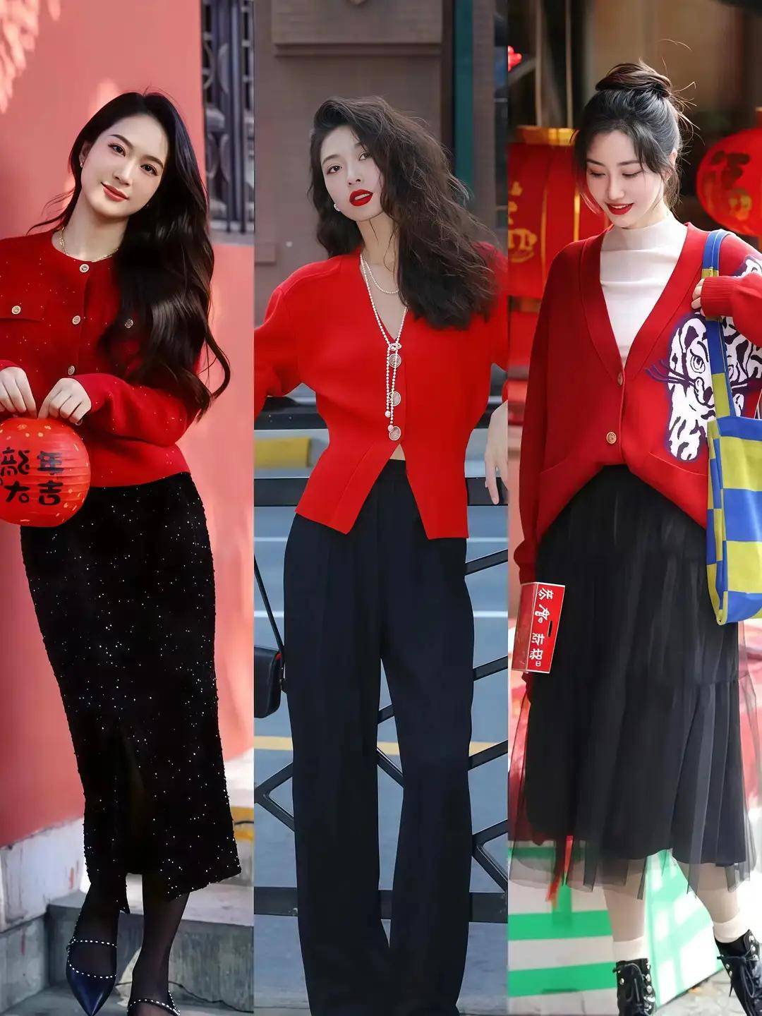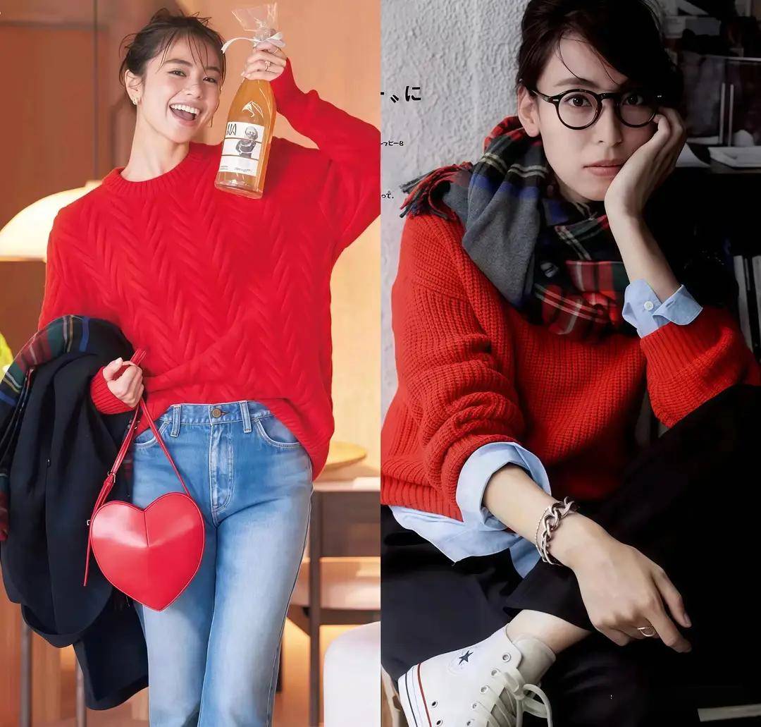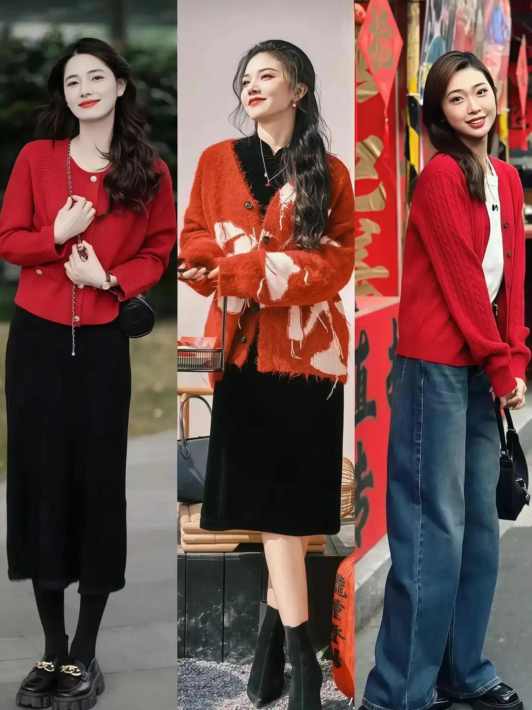 走亲访友:红色毛衣(安可拉红)+蓝色牛仔裤+短靴,或红色半裙+毛衣,既有过年感又不过于张扬;