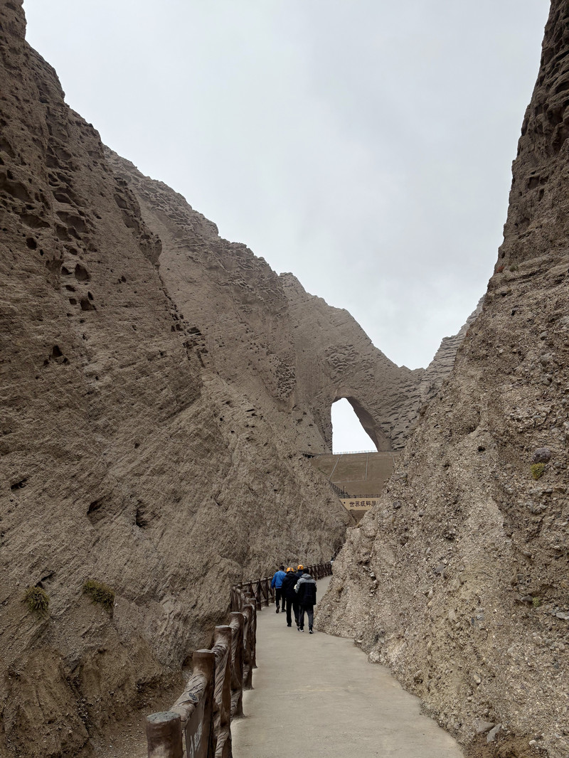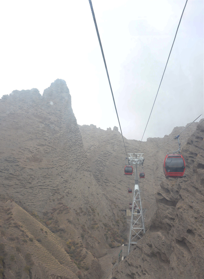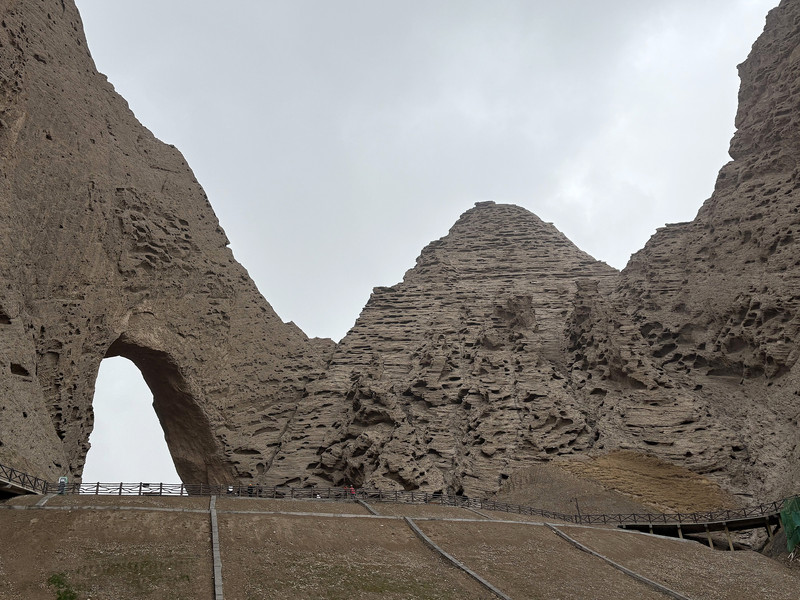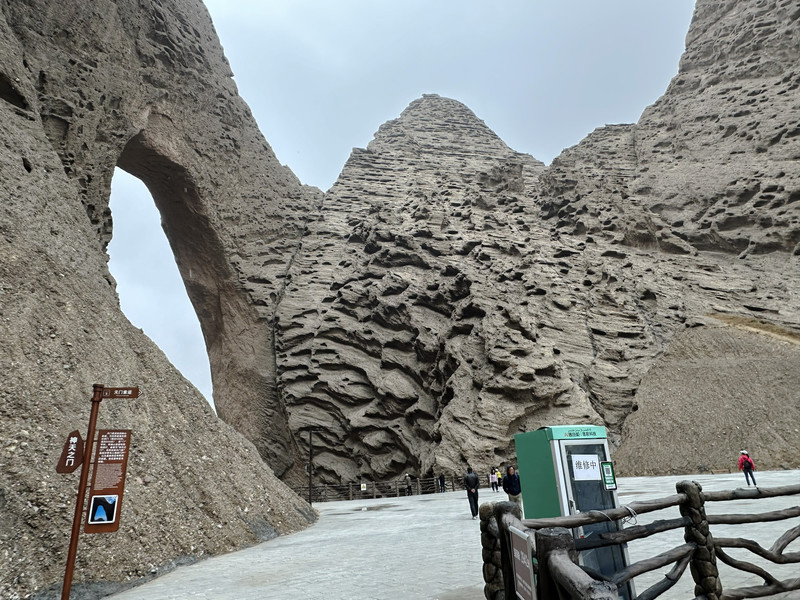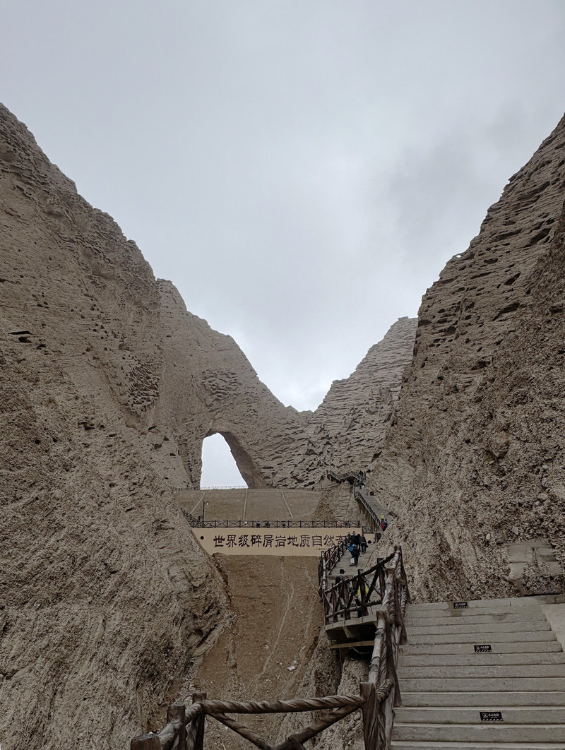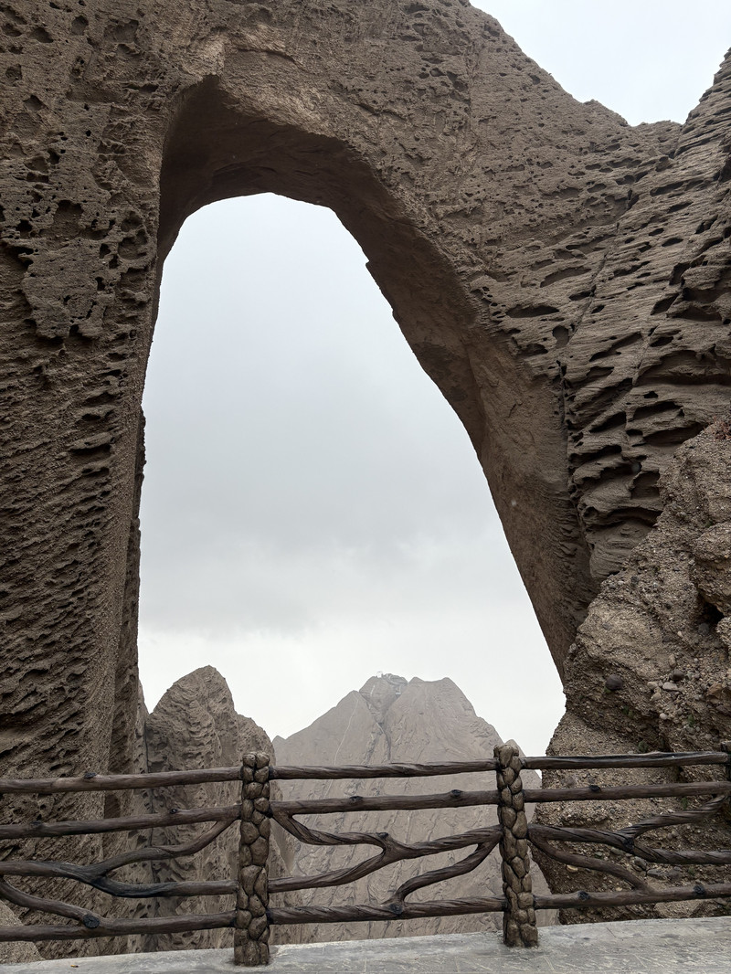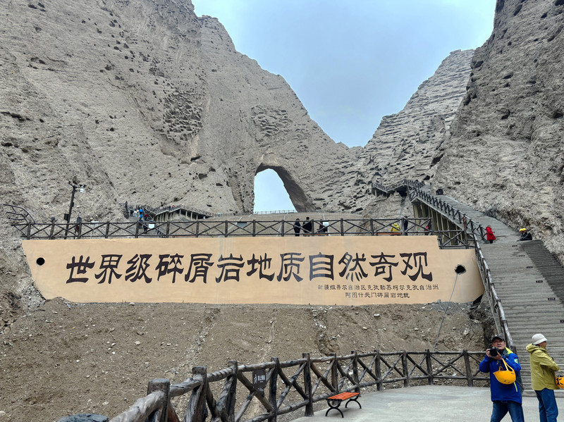 上缆车时,每人发了一顶矿工帽,可能是怕山上掉石头吧。下得缆车,走了长长的水泥坡道,再爬约400级台阶,到达天门面前。阿图什天门是一座天然形成的n型的巨大拱门,据说高近500米,宽约120米,称为“神天之门”。天门左壁表面像壁画,右壁石穴像蜂巢,再右是“四大天王”,山峰之上有一小“天门”,十分壮观。