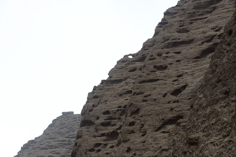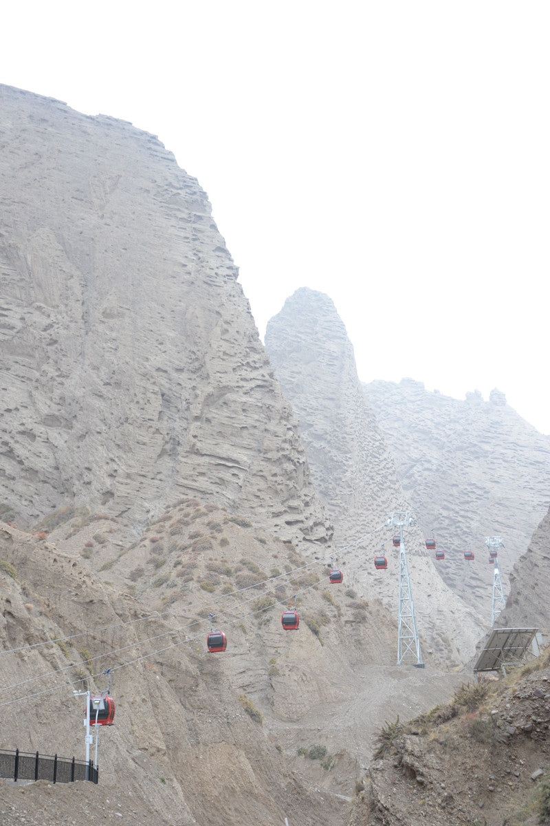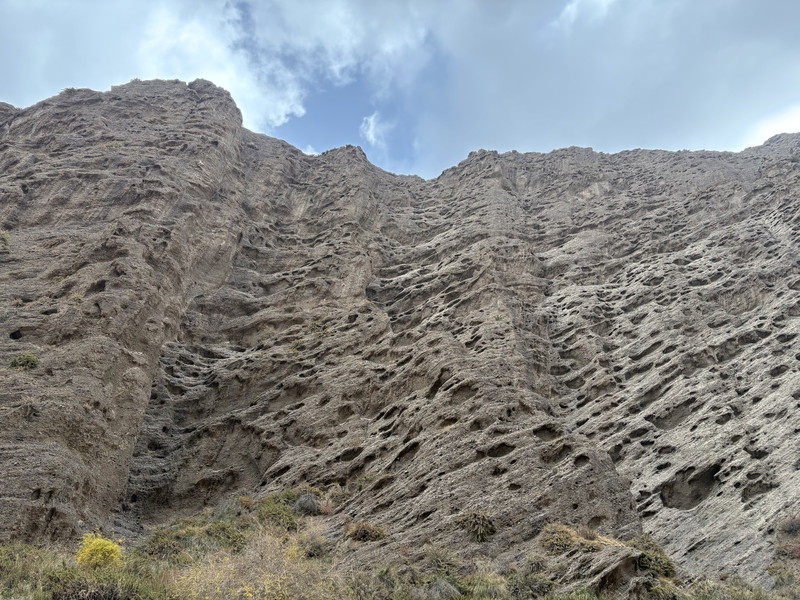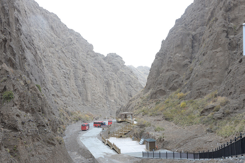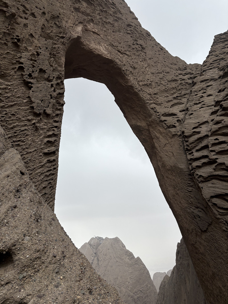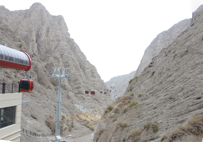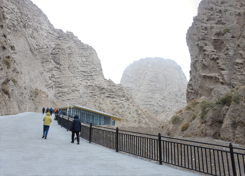 上缆车时,每人发了一顶矿工帽,可能是怕山上掉石头吧。下得缆车,走了长长的水泥坡道,再爬约400级台阶,到达天门面前。阿图什天门是一座天然形成的n型的巨大拱门,据说高近500米,宽约120米,称为“神天之门”。天门左壁表面像壁画,右壁石穴像蜂巢,再右是“四大天王”,山峰之上有一小“天门”,十分壮观。