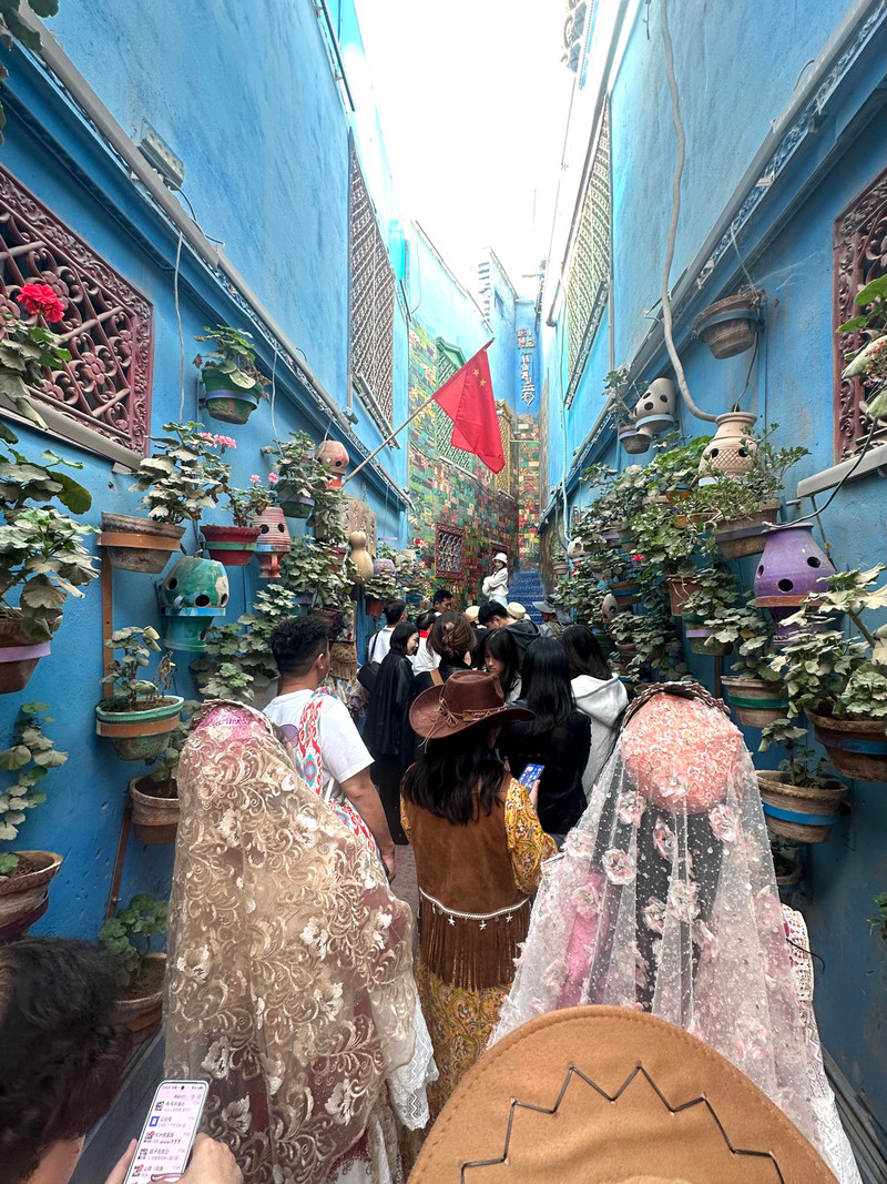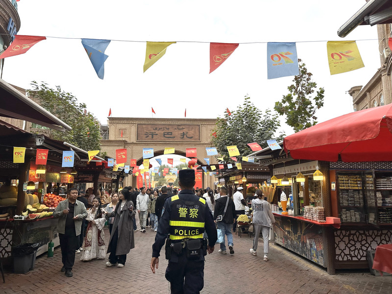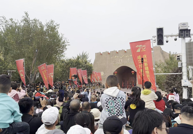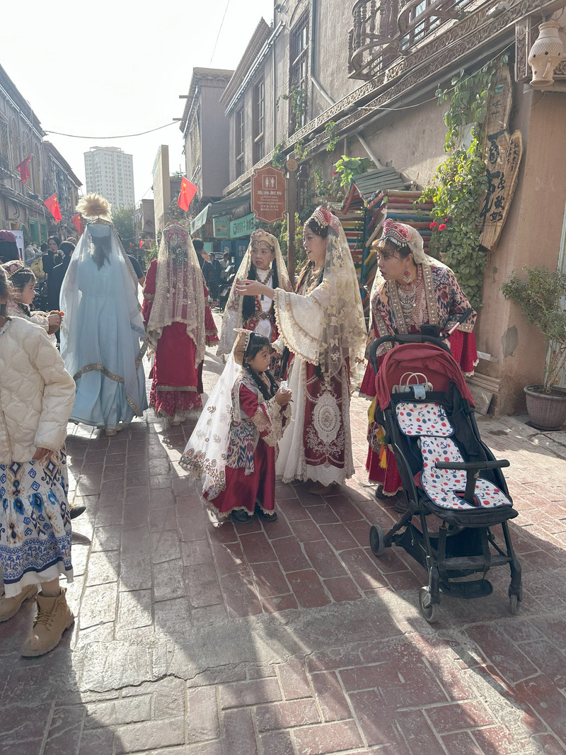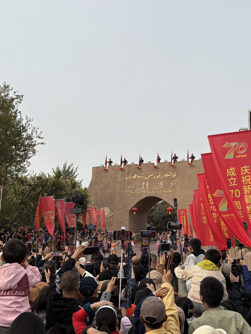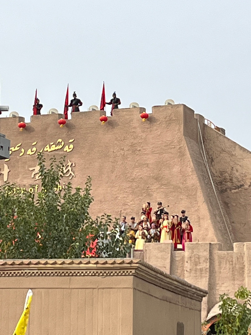 10点半,开城仪式正式开始。随着鼓点响起,沉重的古城大门“吱吱”打开,并立即开启了历史穿越模式。只见张骞、班超携领一众人等从公元前138年走来,诉说出使西域的传奇征程,重现丝绸之路的辉煌往昔,使人深深体悟到喀什作为丝路明珠的无穷魅力。接着汉唐舞、波斯舞、龟兹乐舞等众多舞蹈形式竞相表演,开城仪式气势恢宏、绚丽多彩,游客们享受了20分钟的西域艺术大餐。