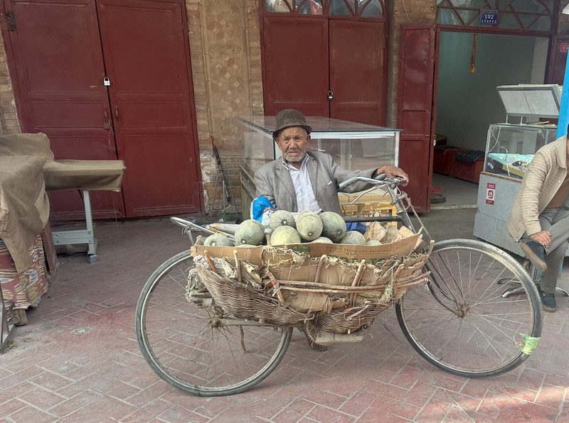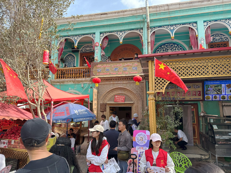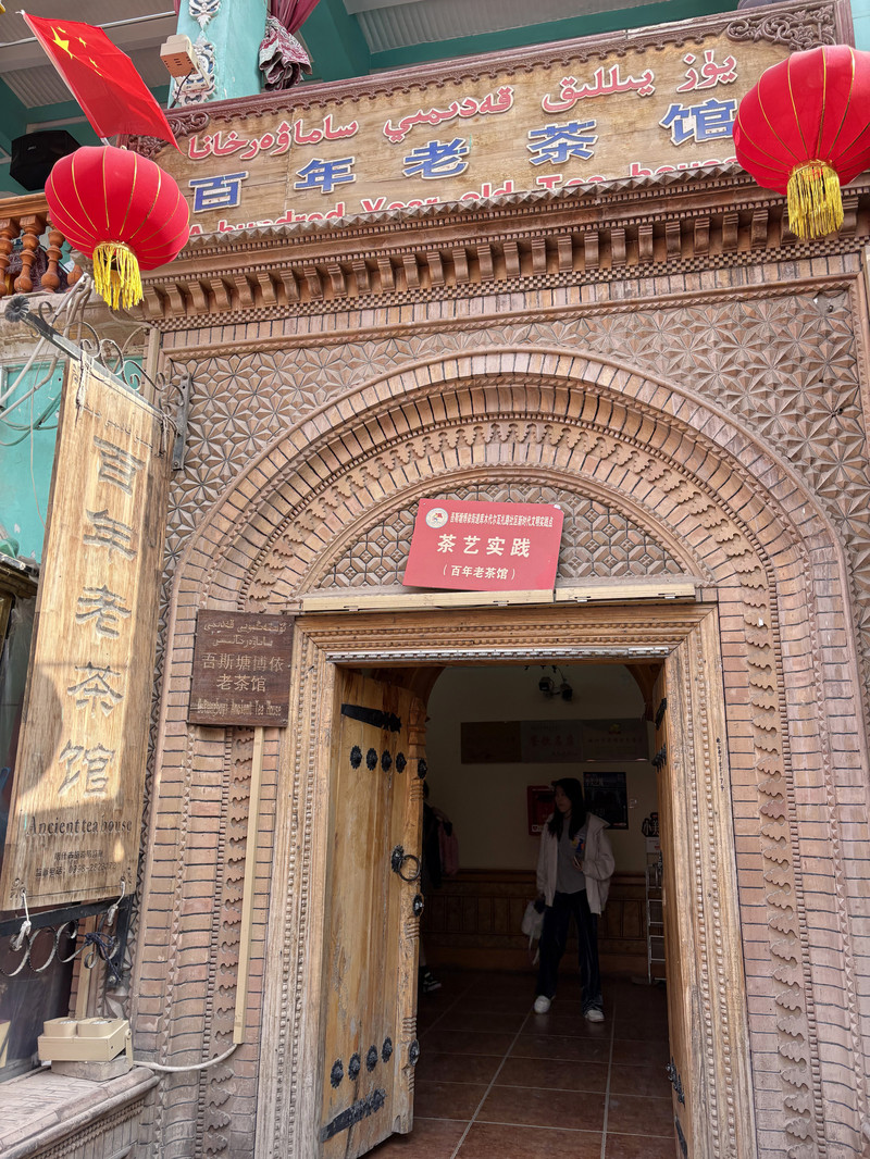下午准备从西门二进古城,4点出发时,发现一拨年经人手上挎着羽绒服,拎着氧气瓶,推着行李箱,在前台办理入住,一看就是从高原下来的。我们计划后天上高原,想了解一下。她们说,我们租了两辆小车上帕米尔高原,今天去冰川,因下雪封山了,没玩成,要不也不会这么早下来,高原天气不算冷。我们8日去冰川,但愿不封山。在古城西城区,我们喝了百年老茶,买了爷爷的爷爷的爸爸的馕。
