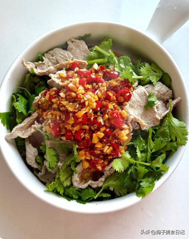 4. 将料汁浇在牛肉上,垫底放香菜叶增香;