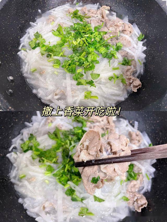 🍜 成品描述:一碗热气腾腾的萝卜羊肉粉,汤色乳白微清,羊肉片薄而嫩,粉条晶莹剔透,绿意点缀其间,极具食欲感。