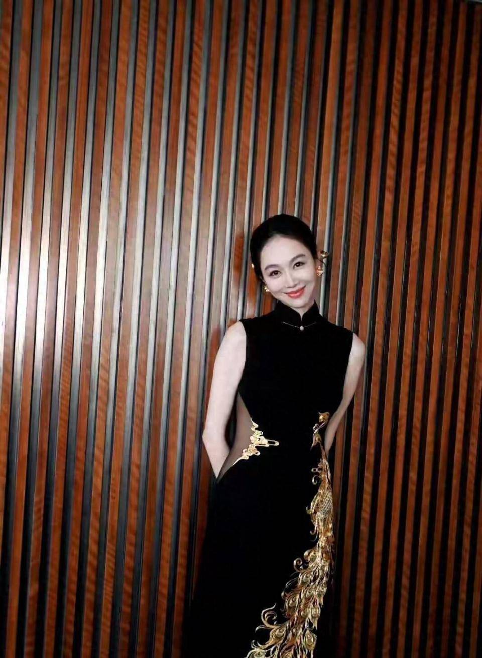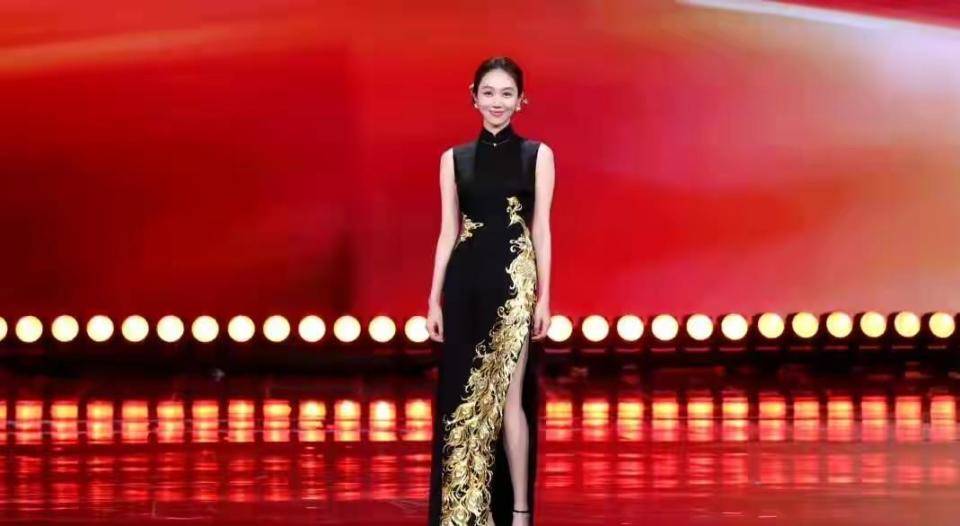 姜妍身穿黑金旗袍亮相的那一刻,现场惊呼声此起彼伏。 这件旗袍以黑色为底,一只栩栩如生的金凤凰从裙摆盘旋至腰际,立领无袖的设计勾勒出她的颈部线条,而腰间若隐若现的薄纱拼接和高开衩裙摆,让她每一步都带着东方的含蓄与现代的大气。 在央视无美颜滤镜的镜头下,39岁的姜妍皮肤白皙透亮,金色发钗与耳环点缀其间,网友评价她“撑起了国泰民安的脸”。