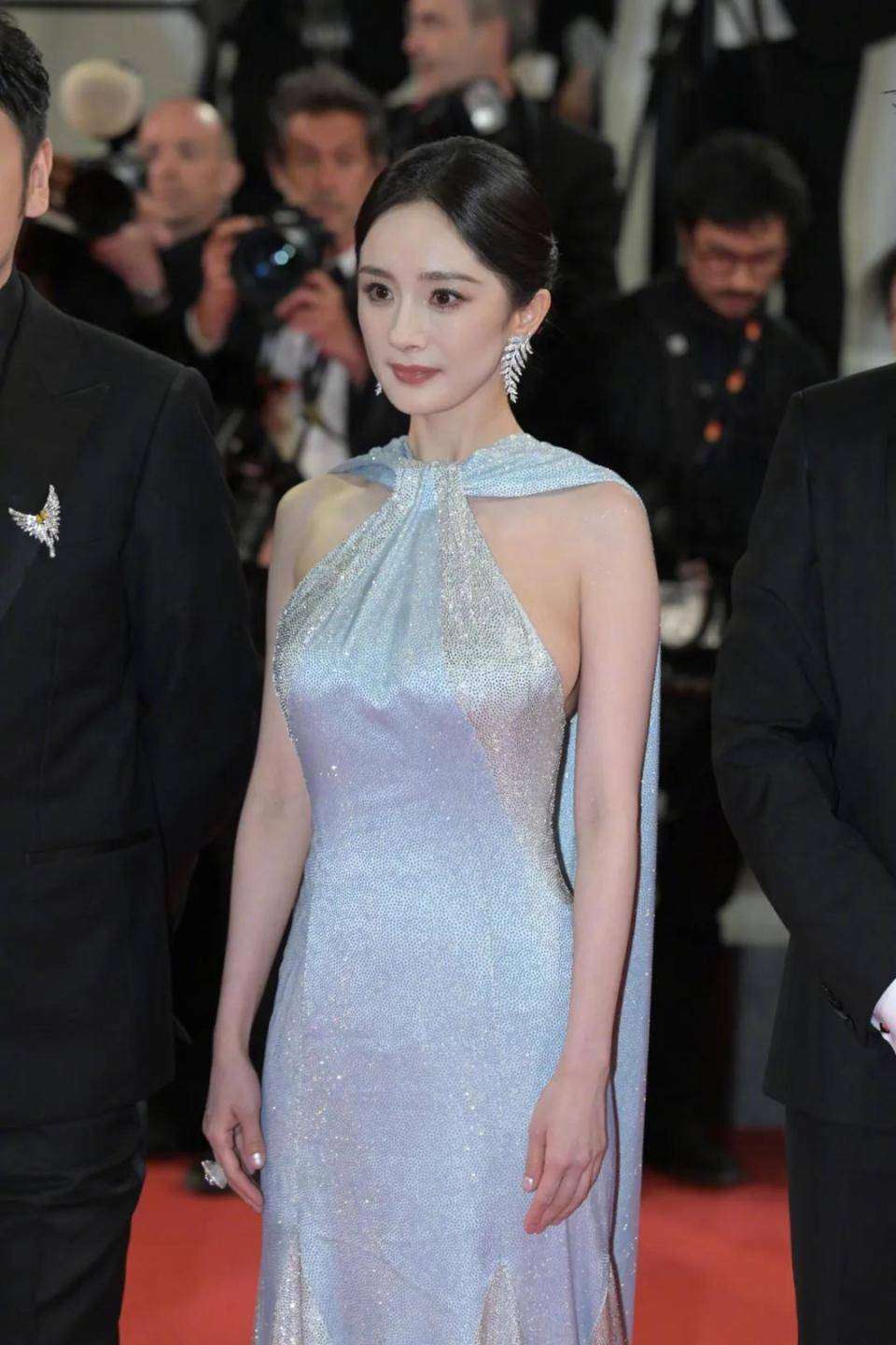 珠宝搭配更是心机满分!耳坠是长款流苏设计,每根链条末端都缀着颗水滴形蓝宝石,随着动作轻轻摇晃时简直像把星空戴在了耳朵上。手腕上的钻石手镯更绝,不是常见的圆环造型,而是用碎钻拼成的藤蔓花纹,和裙子上的刺绣遥相呼应。最绝的是她居然没戴项链!让V领处的肌肤成为最天然的装饰,这种"留白美学"真的只有真·天鹅颈才能驾驭。