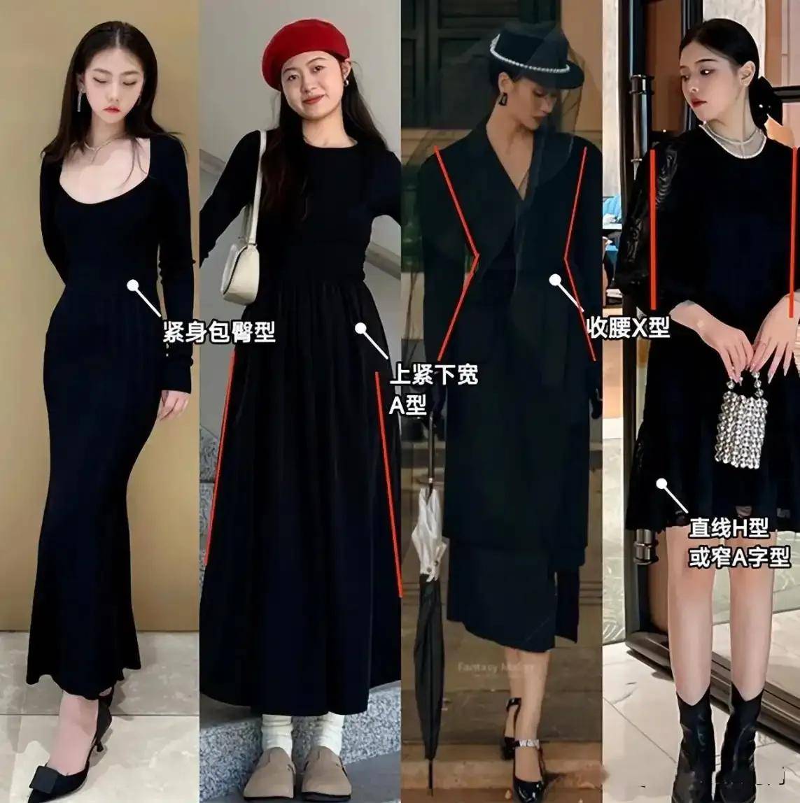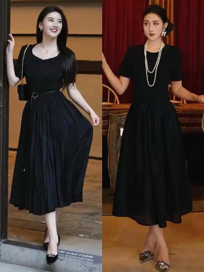 不过当你选择黑色的裙子来穿搭,裙子的长度要盖过膝盖超过 3~5cm 最佳。当然,如果小腿肌肉线条比较强,甚至有罗圈腿,裙子长度正好卡在小腿肚的位置脚踝以上,这样才能遮住下半身的腿部缺陷。