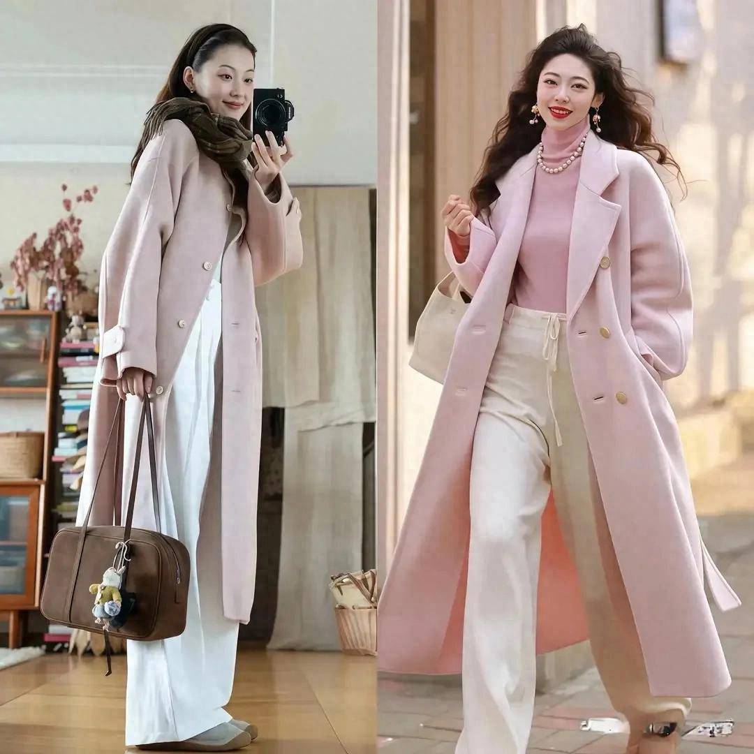 咱们可以学习上图,两位时尚达人用粉色翻脸大衣内搭一件粉色半高领毛衣,搭配一条白色直筒阔腿裤,脚穿雪地靴,这样的穿搭让你显白显嫩显年轻,同时保暖舒适。
