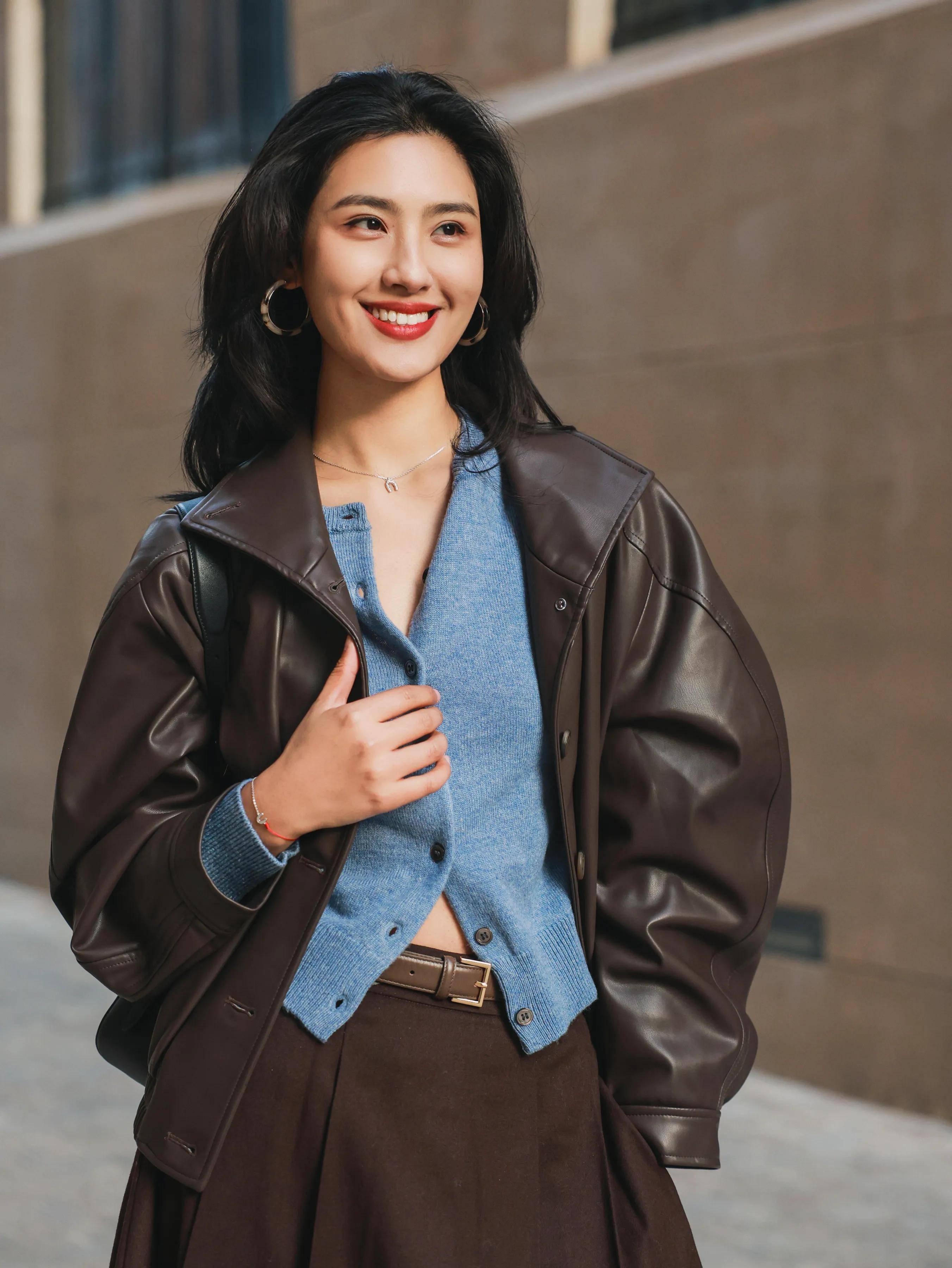 当然啦,如果你不喜欢穿红色的衣服,觉得过于张扬,你也可以用棕咖色的皮衣内搭雾霾蓝的针织开衫,加上一条棕咖色的伞状半身裙,这样的打扮让你又飒又美。