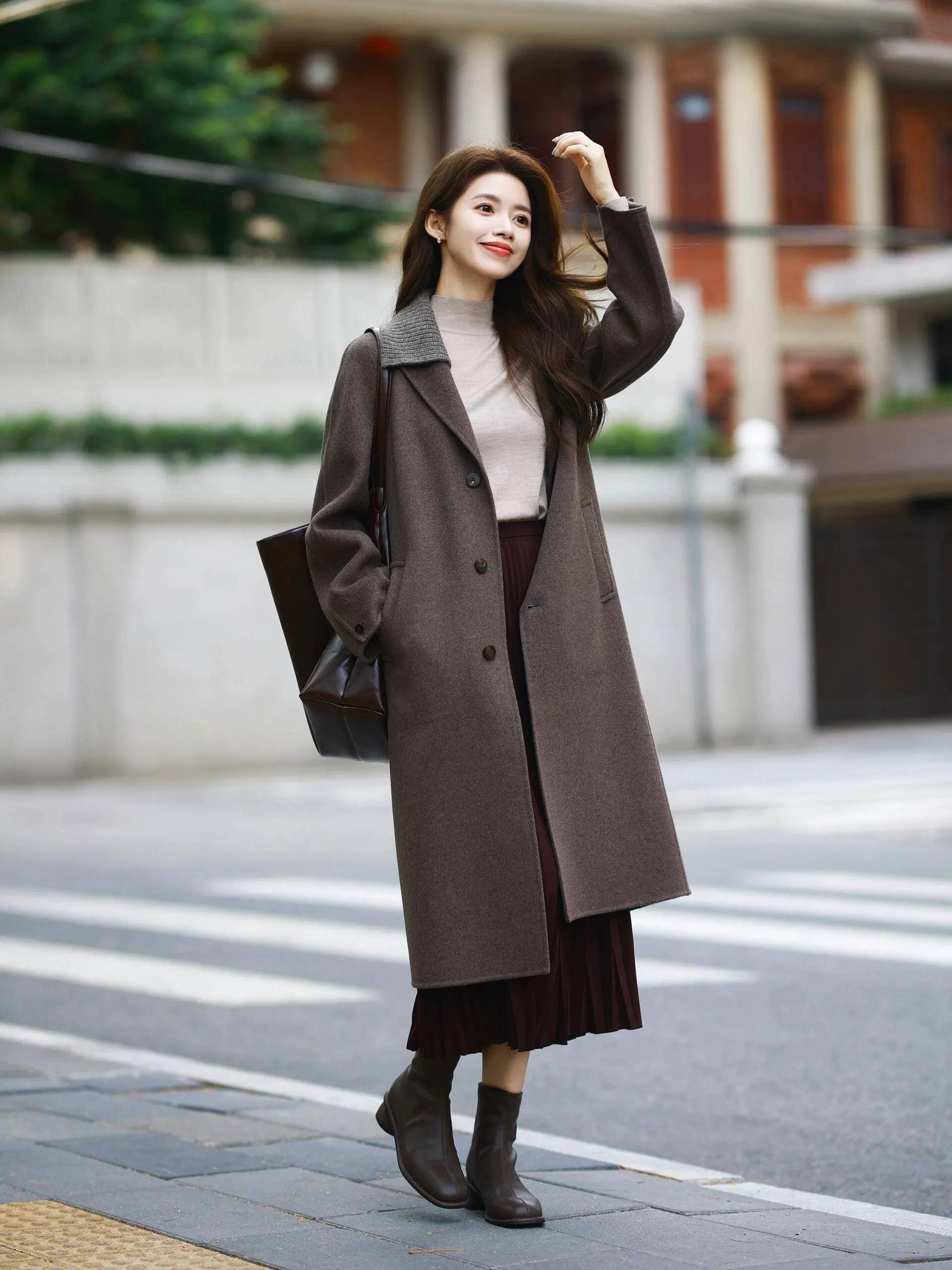 如果我们选择的是百褶半身裙,推荐面料一定要有垂坠感,穿在身上才不会死板,更有品质。内搭一件针织毛衣就能使得你的穿搭变得温柔大气,再加上一件浅灰色的翻领大衣外套,轻松变美。